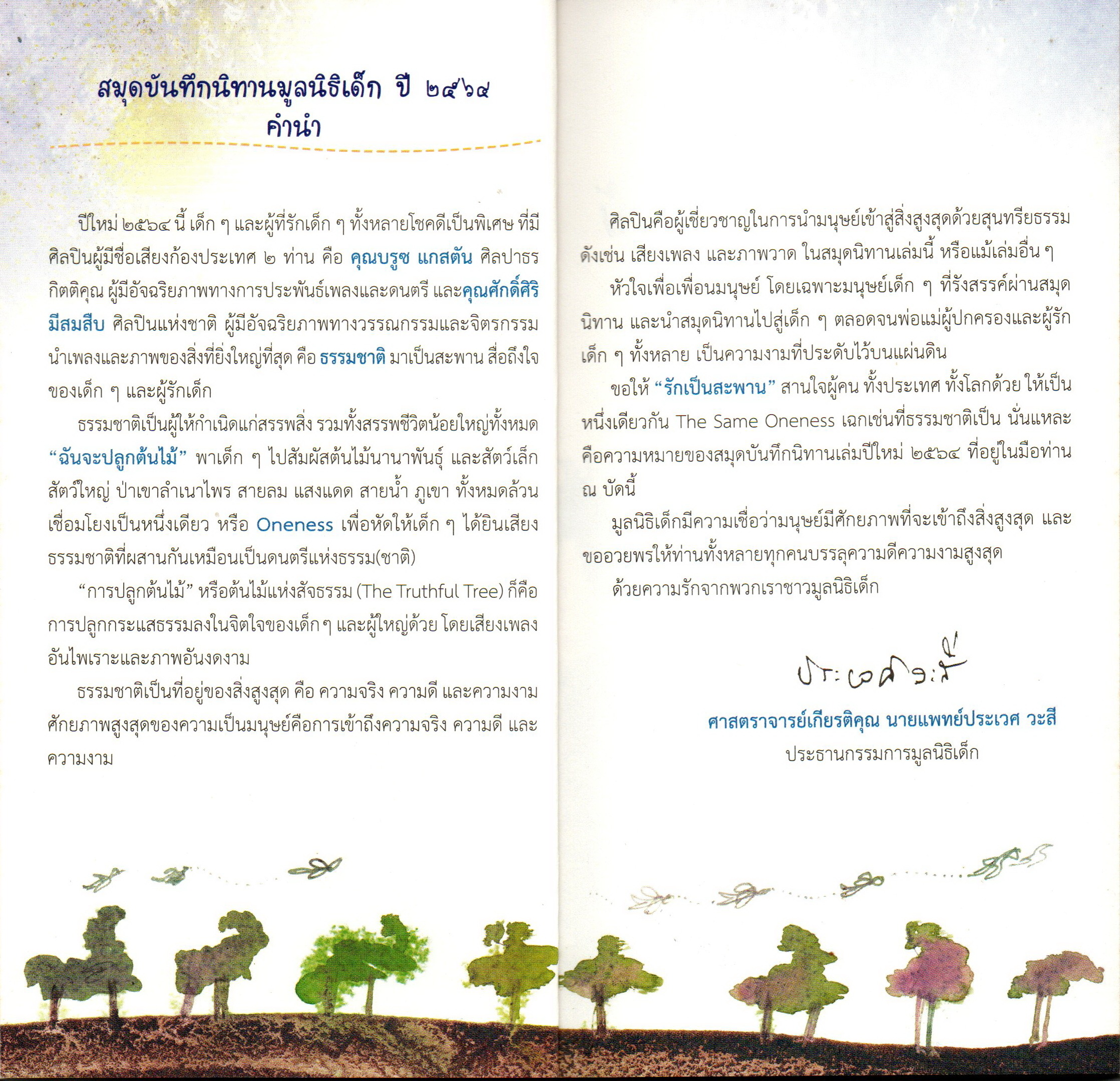 เอกสารคำนำ สมุดบันทึกนิทานมูลนิธิเด็ก 2564 กล่าวถึง ธรรมชาติเป็นผู้ให้กำเนิดแก่สรรพสิ่ง ธรรมชาติที่เป็นสิ่งสูงสุด คือ ความจริง ความดี และความงาม ศักยภาพสูงสุดของความเป็นมนุษย์ คือการเข้าถึงความจริง ความดี และความงาม และ มูลนิธิเด็ก มีความเชื่อว่ามนุษย์มีศักยภาพที่จะเข้าถึงสิ่งสูงสุด และขออวยพรให้ท่านทั้งหลายทุกคนบรรลุความดีความงามสูงสุด" ซึ่งเขียนโดย ศ.นพ.ประเวศ วะสี