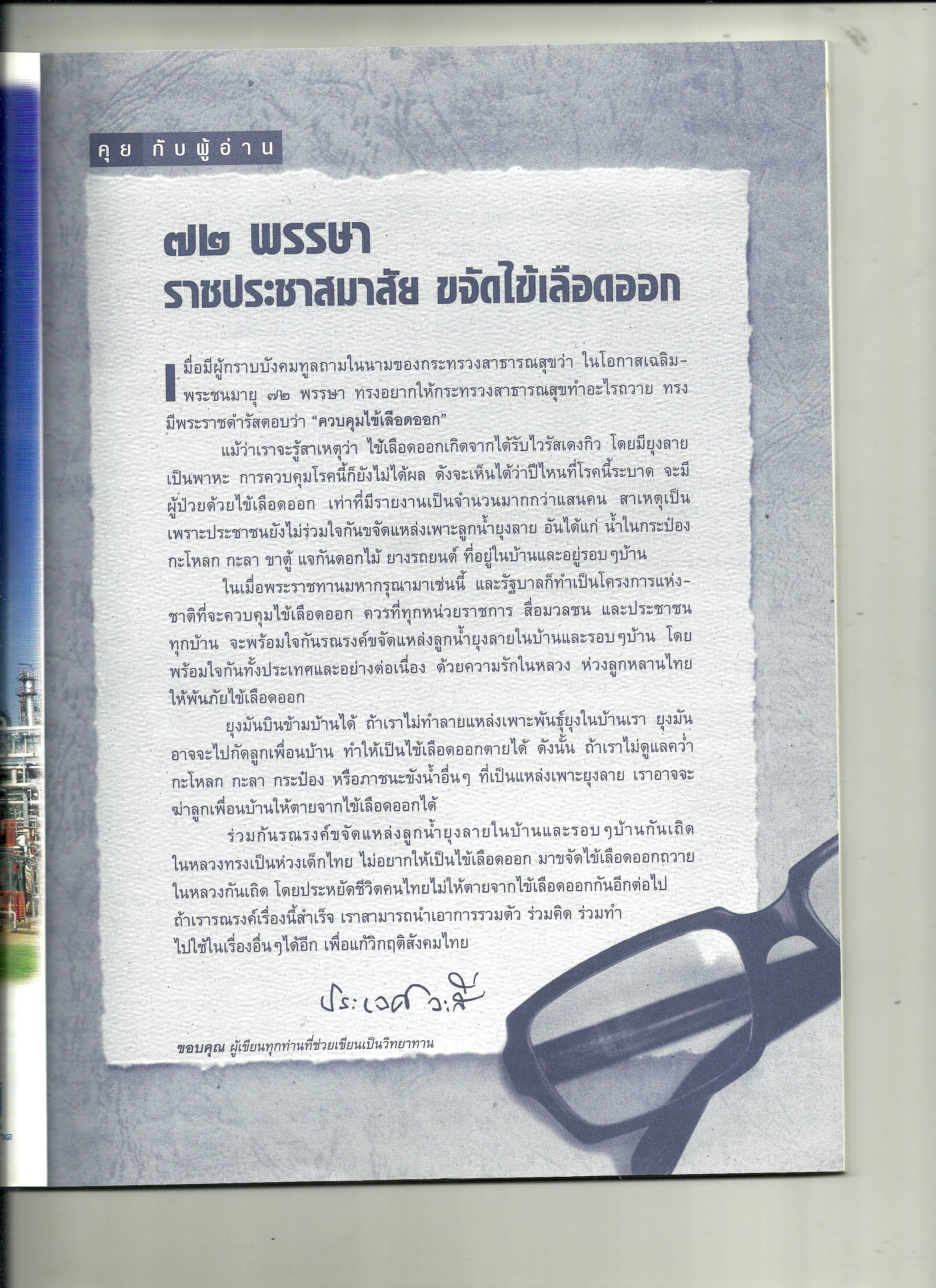 คุยกับผู้อ่าน : 72 พรรษา ราชประชาสมาสัย ขจัดไข้เลือดออก (นิตยสารหมอชาวบ้าน ฉบับที่ 241 เดือนพฤษภาคม พ.ศ. 2542)