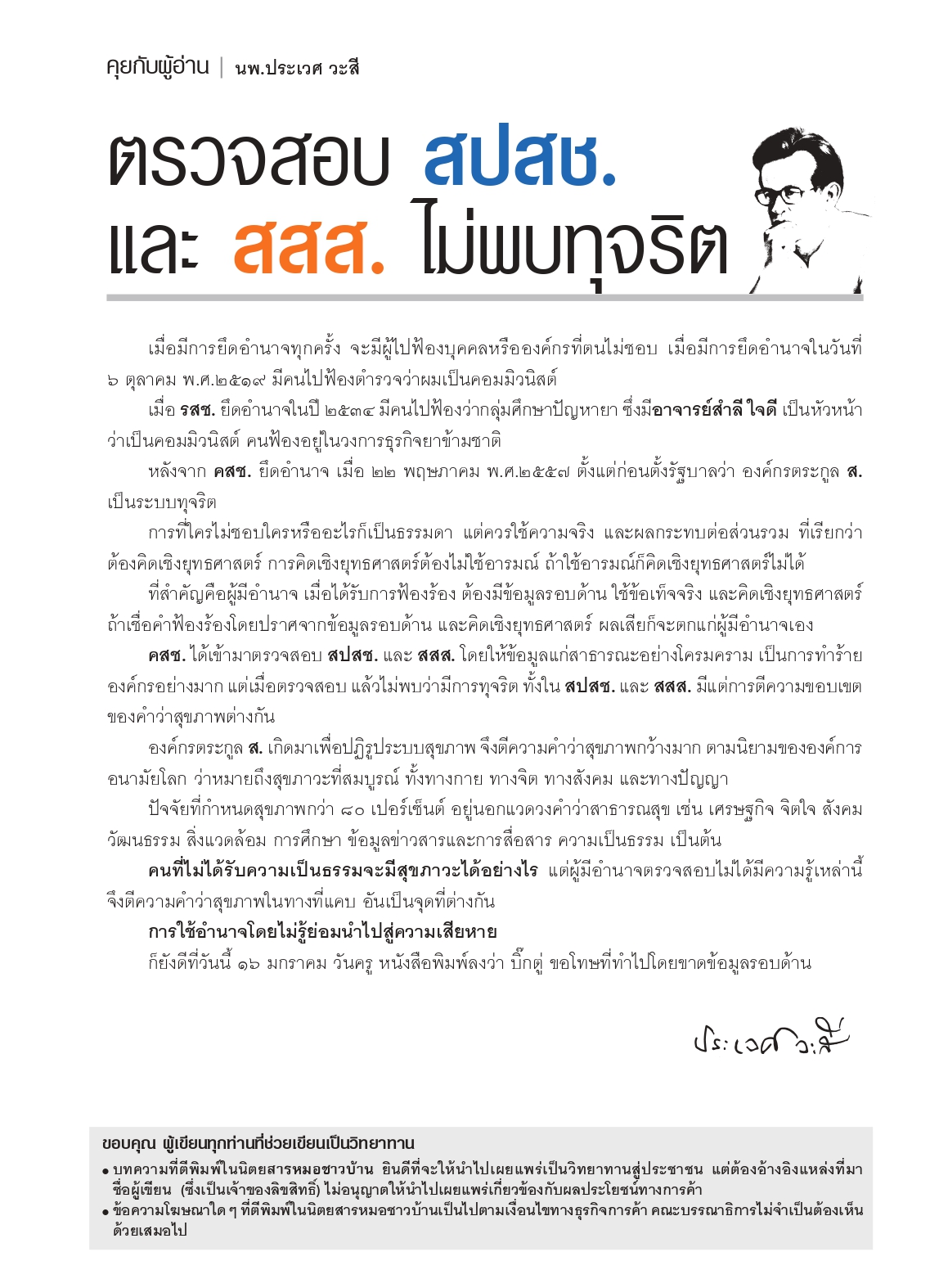 คุยกับผู้อ่าน : ตรวจสอบสปสช. และ สสส. ไม่พบทุจริต (นิตยสารหมอชาวบ้าน พ.ศ. 2559)