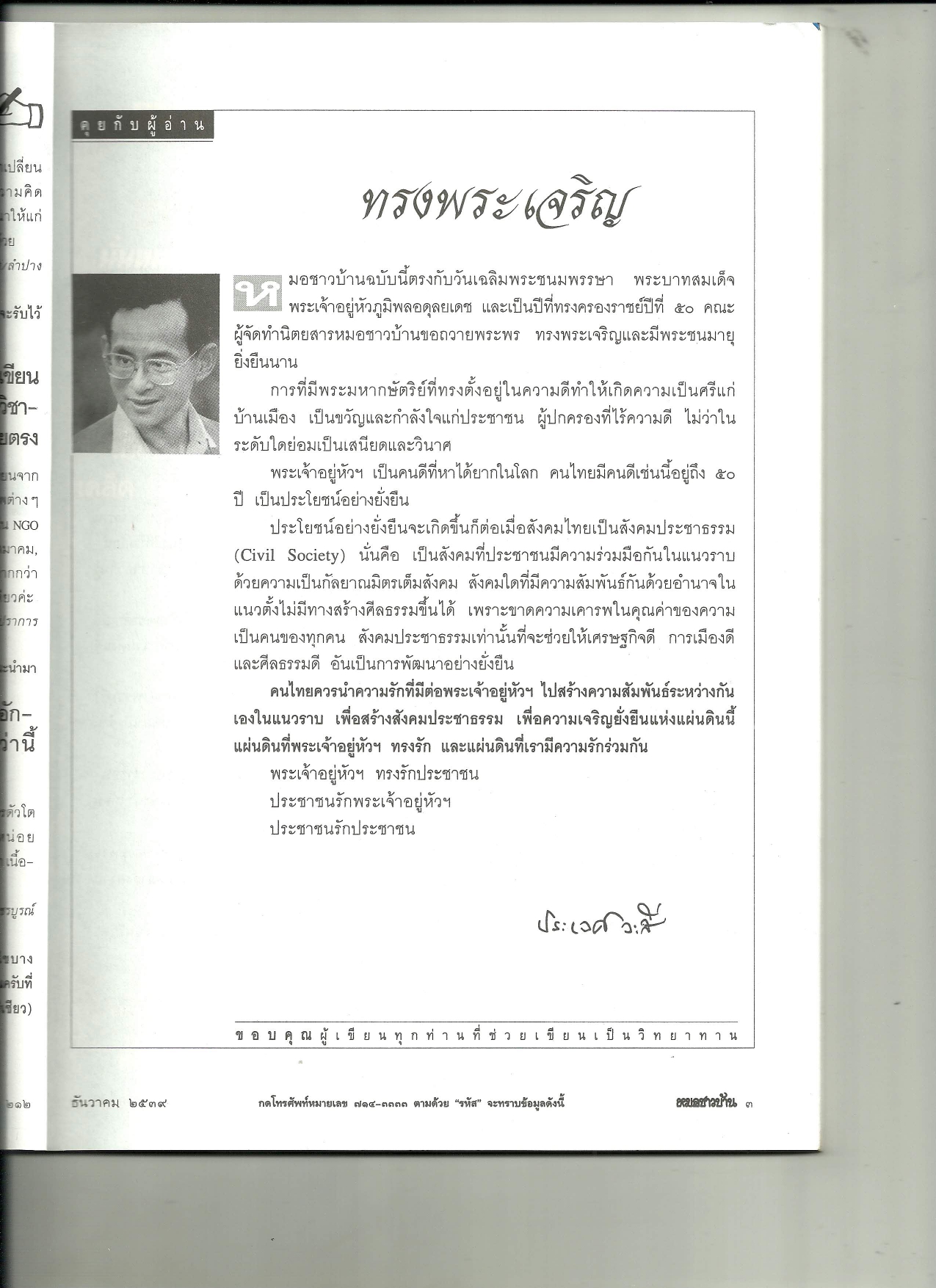 เนื้อหาในเอกสารกล่าวถึงการถวายพระพรแด่พระบาทสมเด็จพระเจ้าอยู่หัวภูมิพลอดุลยเดช เนื่องในโอกาสเฉลิมพระชนมพรรษา และเป็นปีที่ทรงครองราชย์ปีที่ 50 นอกจากนี้ยังกล่าวถึงสังคมประชาธรรม (Civil Society) คือ สังคมที่ประชาชนมีความร่วมมือในแนวราบด้วยความเป็นกัลยาณมิตร -