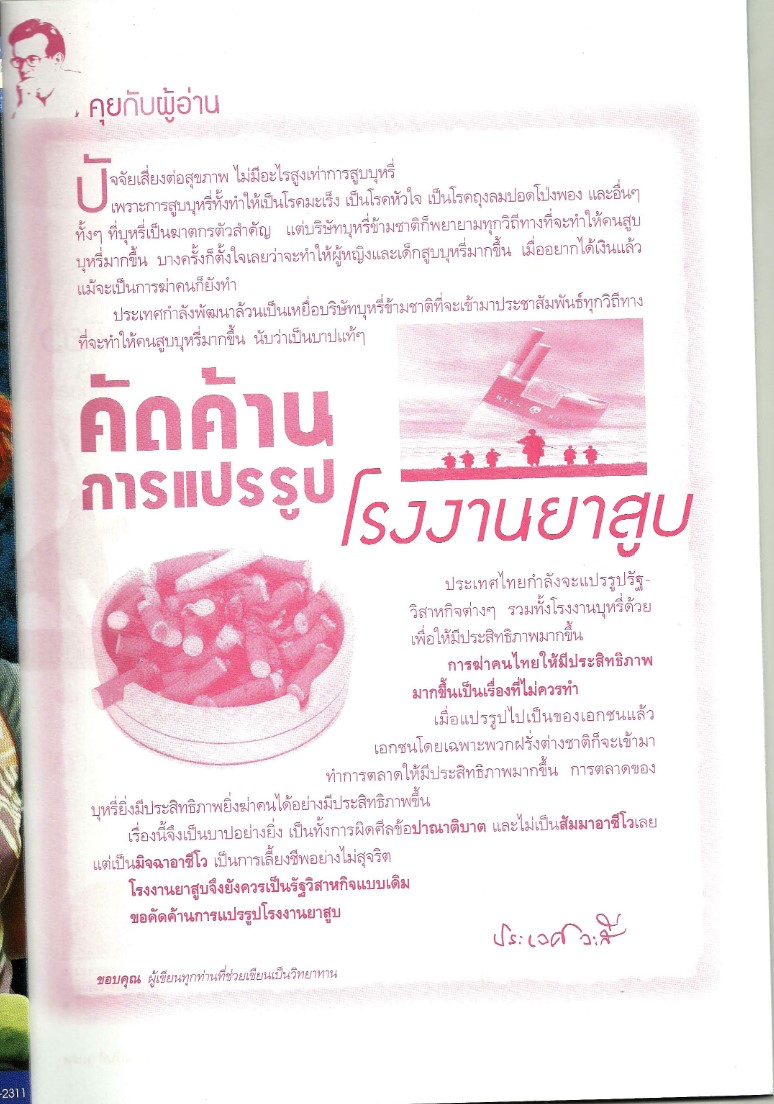 คุยกับผู้อ่าน : คัดค้านการแปรรูปโรงงานยาสูบ (นิตยสารหมอชาวบ้าน ฉบับที่ 279 เดือนกรกฎาคม พ.ศ. 2545)