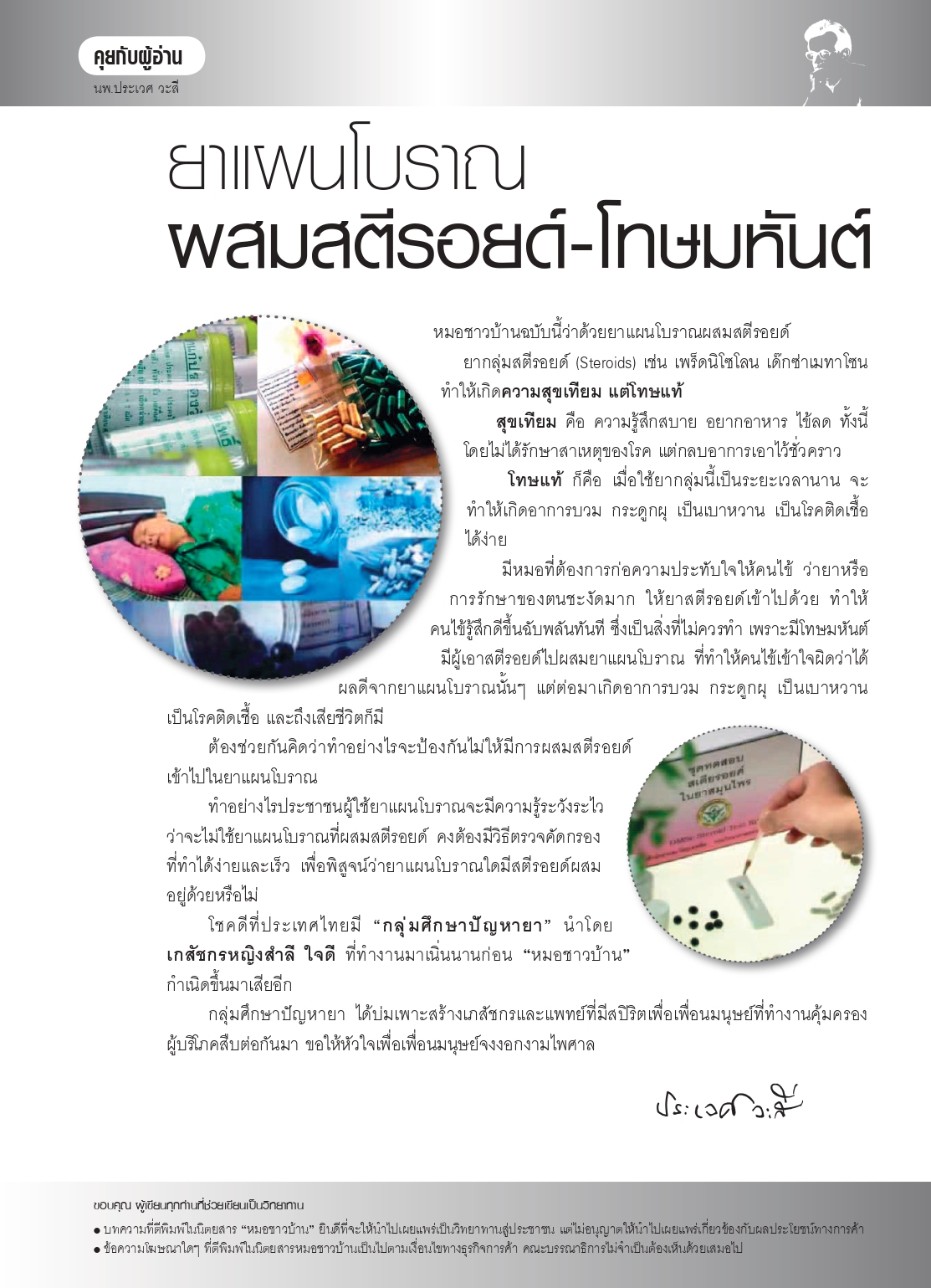 คุยกับผู้อ่าน : ยาแผนโบราณ ผสมสตีรอยด์-โทษมหันต์ (นิตยสารหมอชาวบ้าน พ.ศ. 2555)