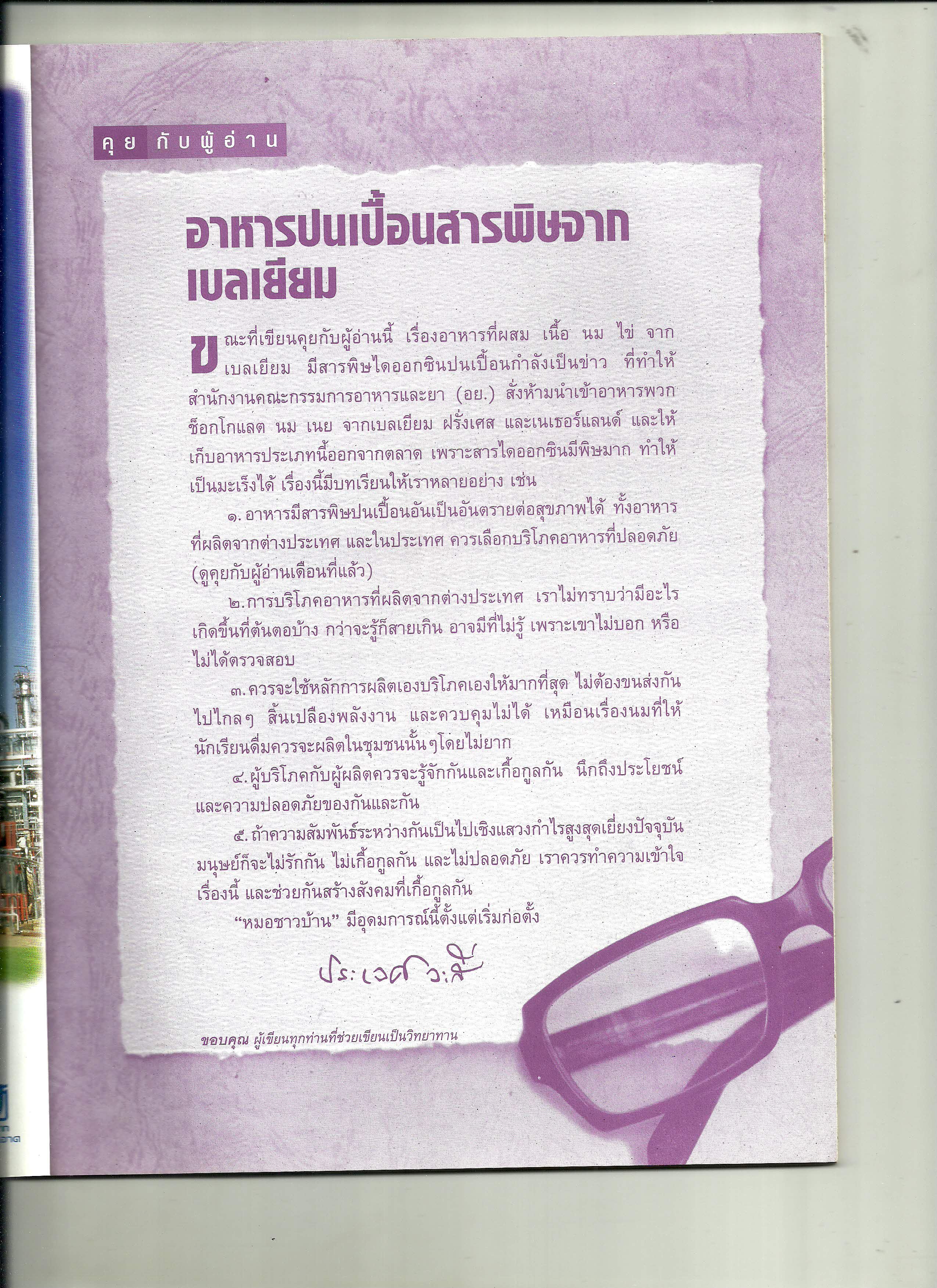 คุยกับผู้อ่าน : อาหารปนเปื้อนสารพิษจากเบลเยียม (นิตยสารหมอชาวบ้าน ฉบับที่ 243 เดือนกรกฎาคม พ.ศ. 2542)