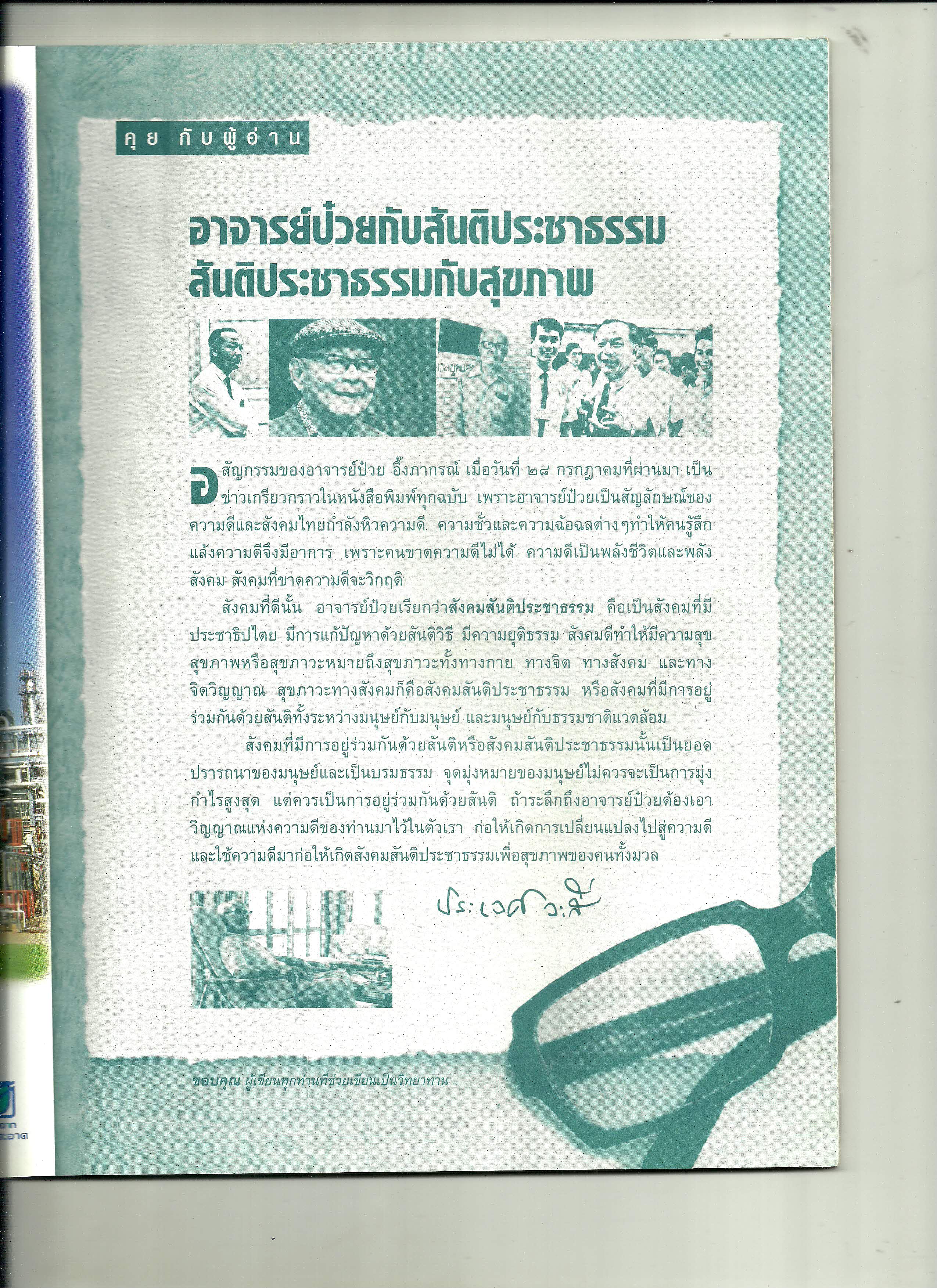 คุยกับผู้อ่าน : อาจารย์ป๋วยกับสันติประชาธรรม สันติประชาธรรมกับสุขภาพ (นิตยสารหมอชาวบ้าน ฉบับที่ 245 เดือนกันยายน พ.ศ. 2542)