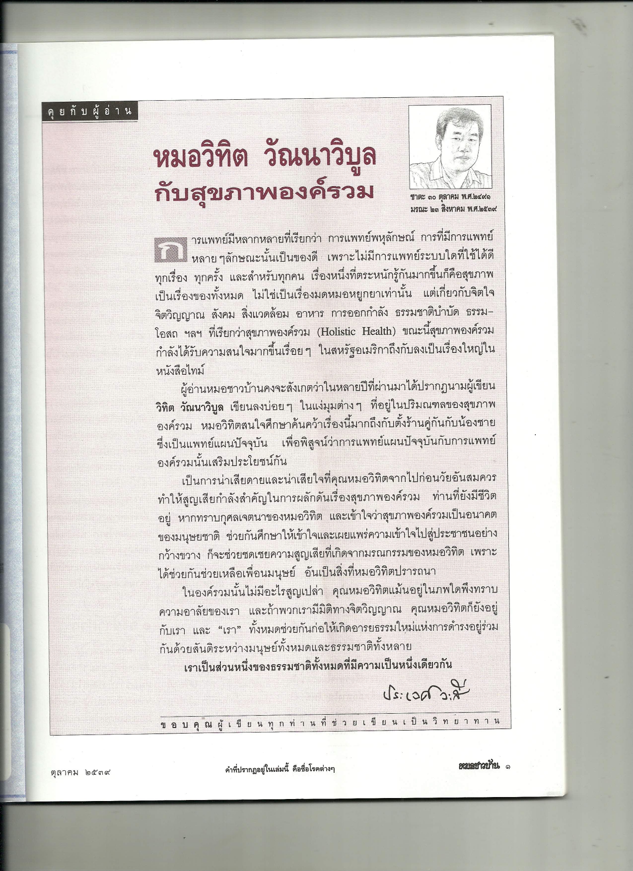 คุยกับผู้อ่าน : หมอวิทิต วัณนาวิบูล กับสุขภาพองค์รวม (นิตยสารหมอชาวบ้าน ฉบับที่ 210 เดือนตุลาคม พ.ศ. 2539)