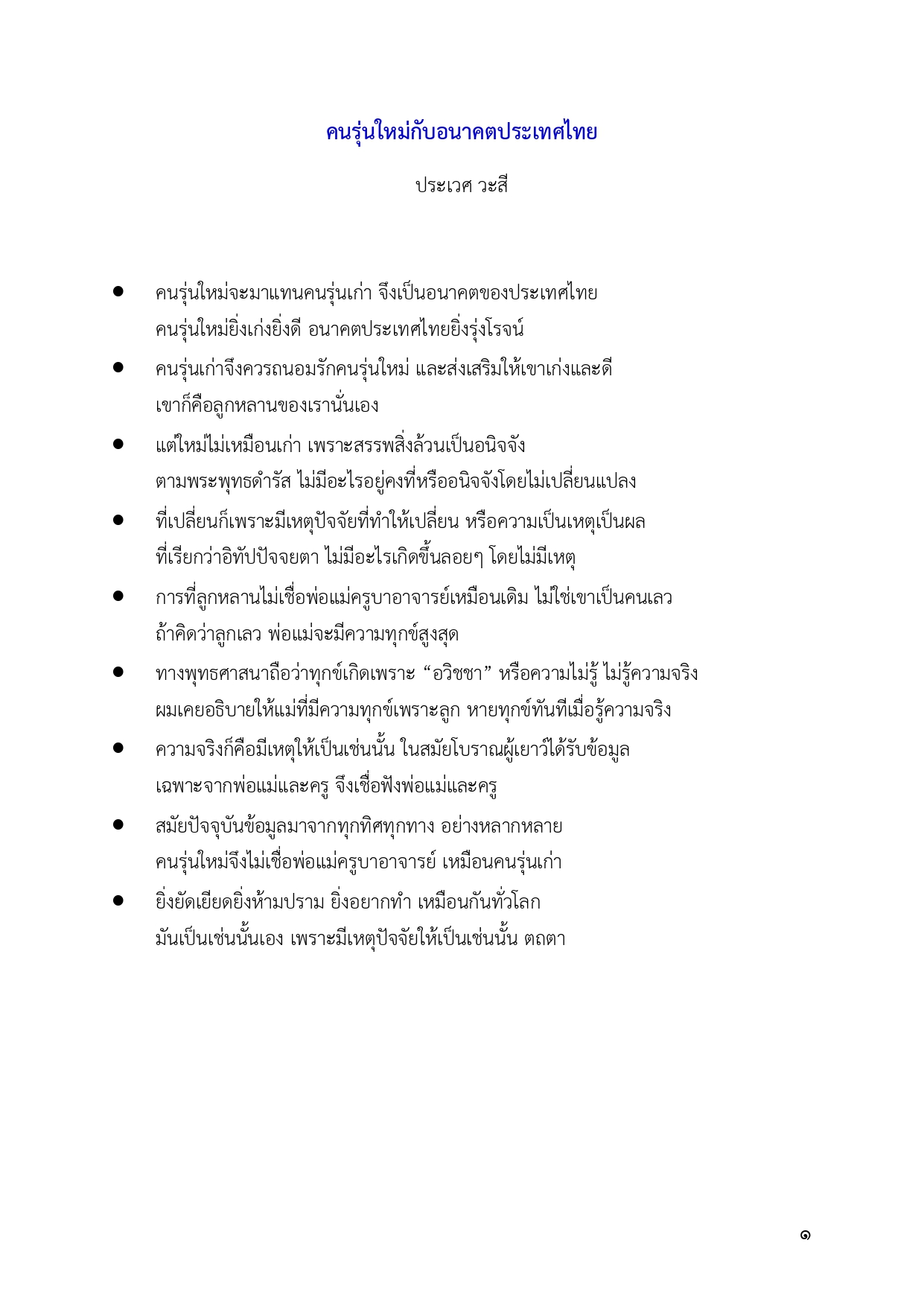 เอกสารนี้มีเนื้อหาสำคัญเกี่ยวกับการที่คนรุ่นใหม่จะมาแทนคนรุ่นเก่า จึงเป็นอนาคตของประเทศไทย คนรุ่นใหม่ยิ่งเก่งยิ่งดี อนาคตประเทศไทยยิ่งรุ่งโรจน์ คนรุ่นเก่าจึงควรถนอมรักคนรุ่นใหม่ และส่งเสริมให้เขาเก่งและดี เขาก็คือลูกหลานของเรานั่นเอง แต่ใหม่ไม่เหมือนเก่า เพราะสรรพสิ่งล้วนเป็นอนิจจัง
