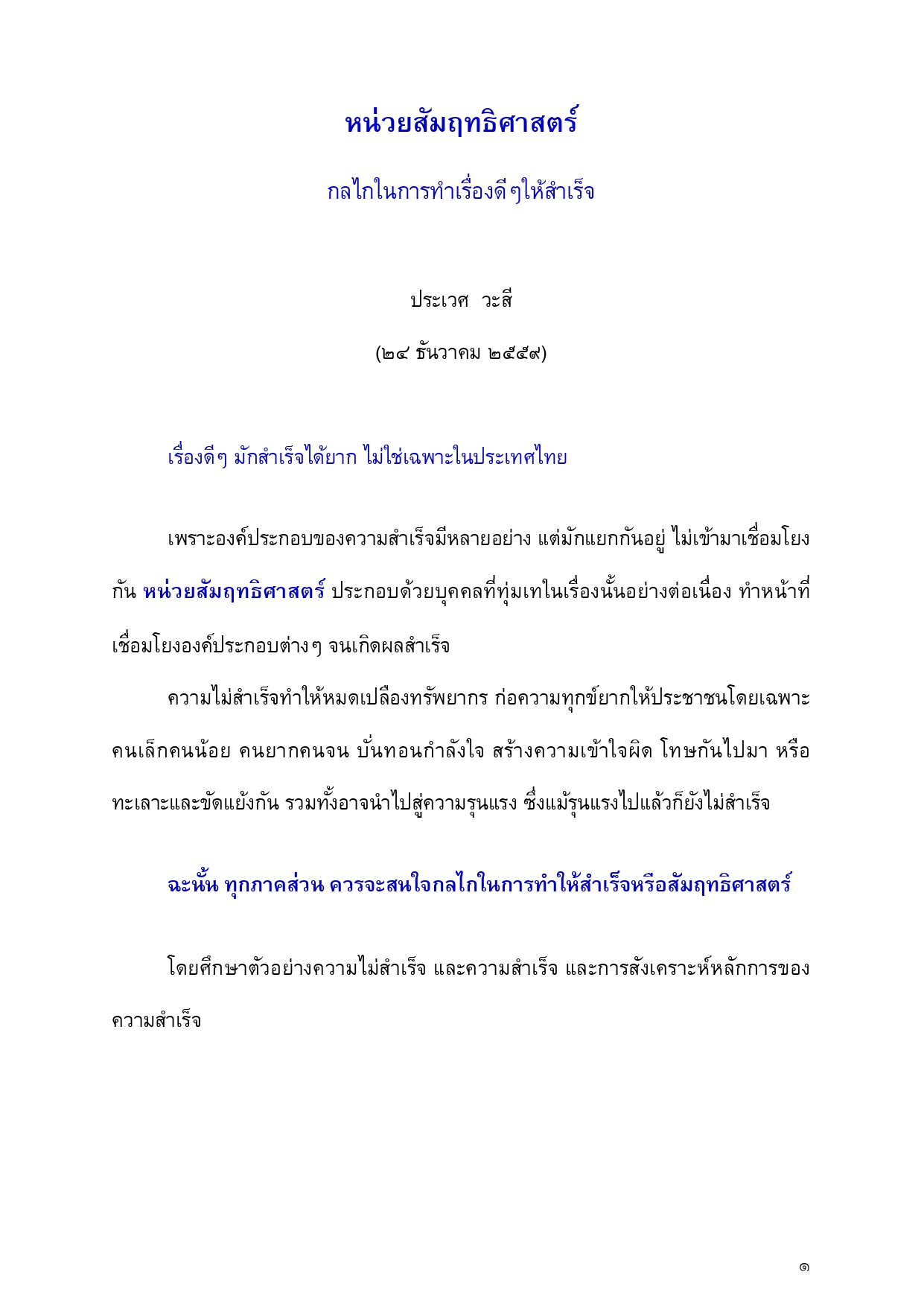 เอกสารนี้มีเนื้อหาสำคัญเกี่ยวกับเรื่องดีๆ มักสําเร็จได้ยาก ไม่ใช่เฉพาะในประเทศไทย เพราะองค์ประกอบของความสําเร็จมีหลายอย่าง แต่มักแยกกันอยู่ ไม่เข้ามาเชื่อมโยงกัน หน่วยสัมฤทธิศาสตร์ประกอบด้วยบุคคลที่ทุ่มเทในเรื่องนั้นอย่างต่อเนื่อง ทําหน้าที่เชื่อมโยงองค์ประกอบต่างๆ จนเกิดผลสําเร็จความไม่สําเร็จทําให้หมดเปลืองทรัพยากร ก่อความทุกข์ยากให้ประชาชนโดยเฉพาะคนเล็กคนน้อยคนยากคนจน บั่นทอนกําลังใจ สร้างความเข้าใจผิด โทษกันไปมาหรือทะเลาะและขัดแย้งกัน รวมทั้งอาจนําไปสู่ความรุนแรง ซึ่งแม้รุนแรงไปแล้วก็ยังไม่สําเร็จฉะนั้น ทุกภาคส่วน ควรจะสนใจกลไกในการทําให้สําเร็จหรือสัมฤทธิศาสตร์
