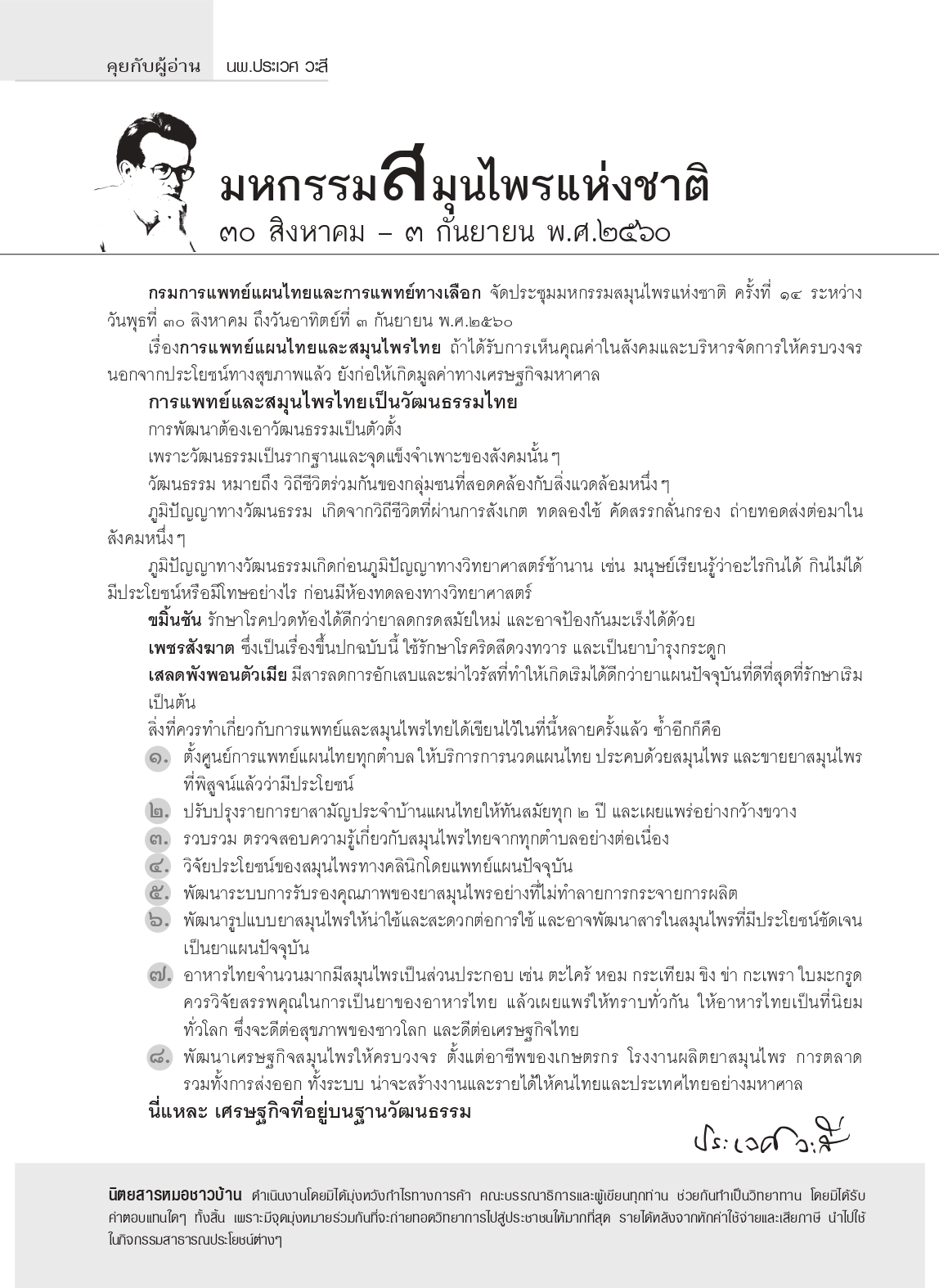 บทบรรณาธิการในนิตยสารหมอชาวบ้านเกี่ยวกับการแพทย์แผนไทยและสมุนไพรไทย ถ้าได้รับการเห็นคุณค่าในสังคมและบริหารจัดการให้ครบวงจรนอกจากประโยชน์ทางสุขภาพแล้ว ยังก่อให้เกิดมูลค่าทางเศรษฐกิจมหาศาล การแพทย์และสมุนไพรไทยเป็นวัฒนธรรมไทย