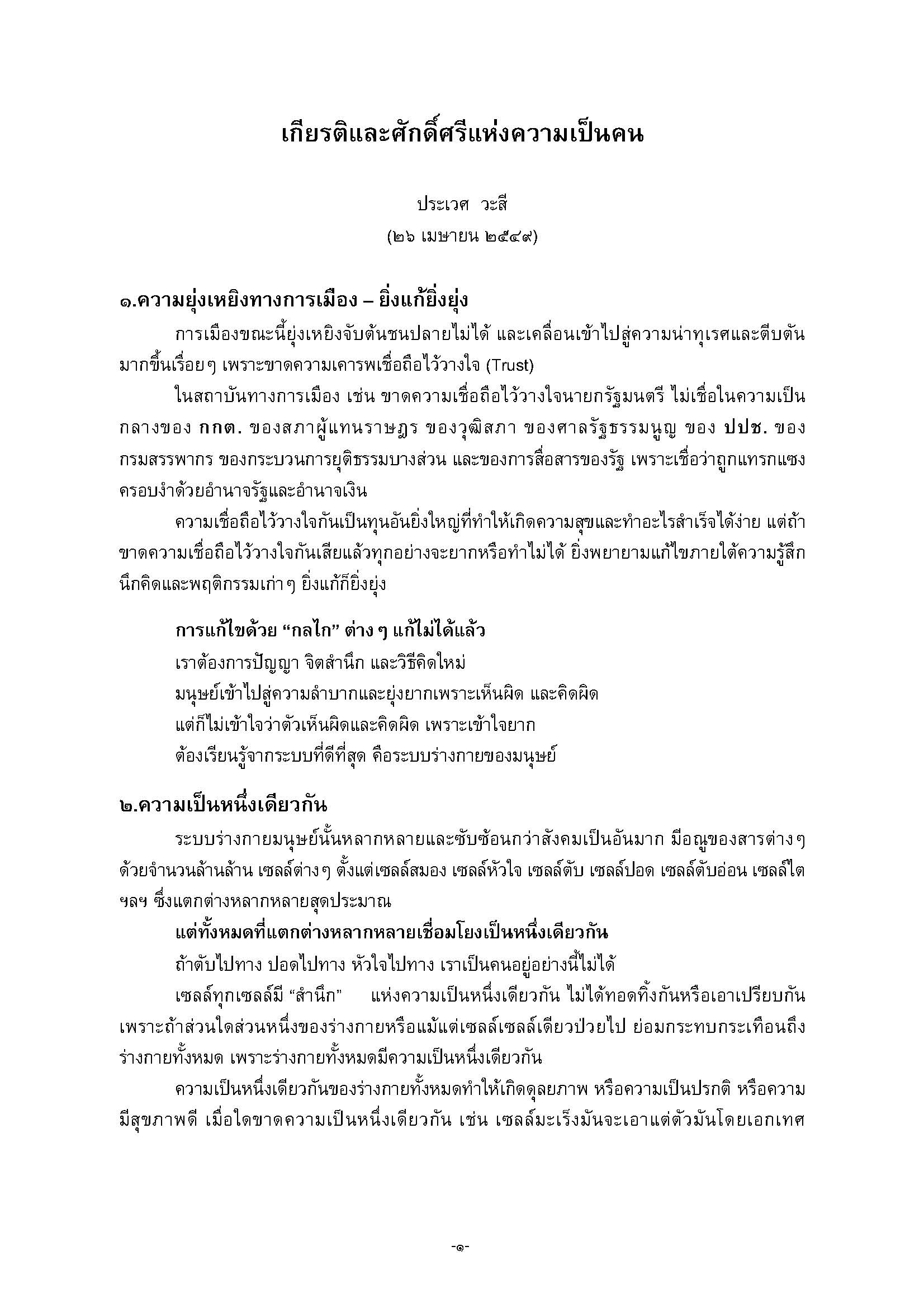 บทความนี้กล่าวถึงเกียรติและศักดิ์ศรีแห่งความเป็นคน มีเนื้อหาดังนี้ 1) ความยุ่งเหยิงทางการเมือง-ยิ่งแก้ยิ่งยุ่ง 2) ความเป็นหนึ่งเดียวกัน 3) เพราะขาดสำนึกแห่งความเป็นหนึ่งเดียวกัน สังคมจึงวิกฤต 4) การแก้ไขแบบ “กลไก” แก้ไม่ได้แล้ว และ 5) จิตสำนึกใหม่ วิธีคิดใหม่