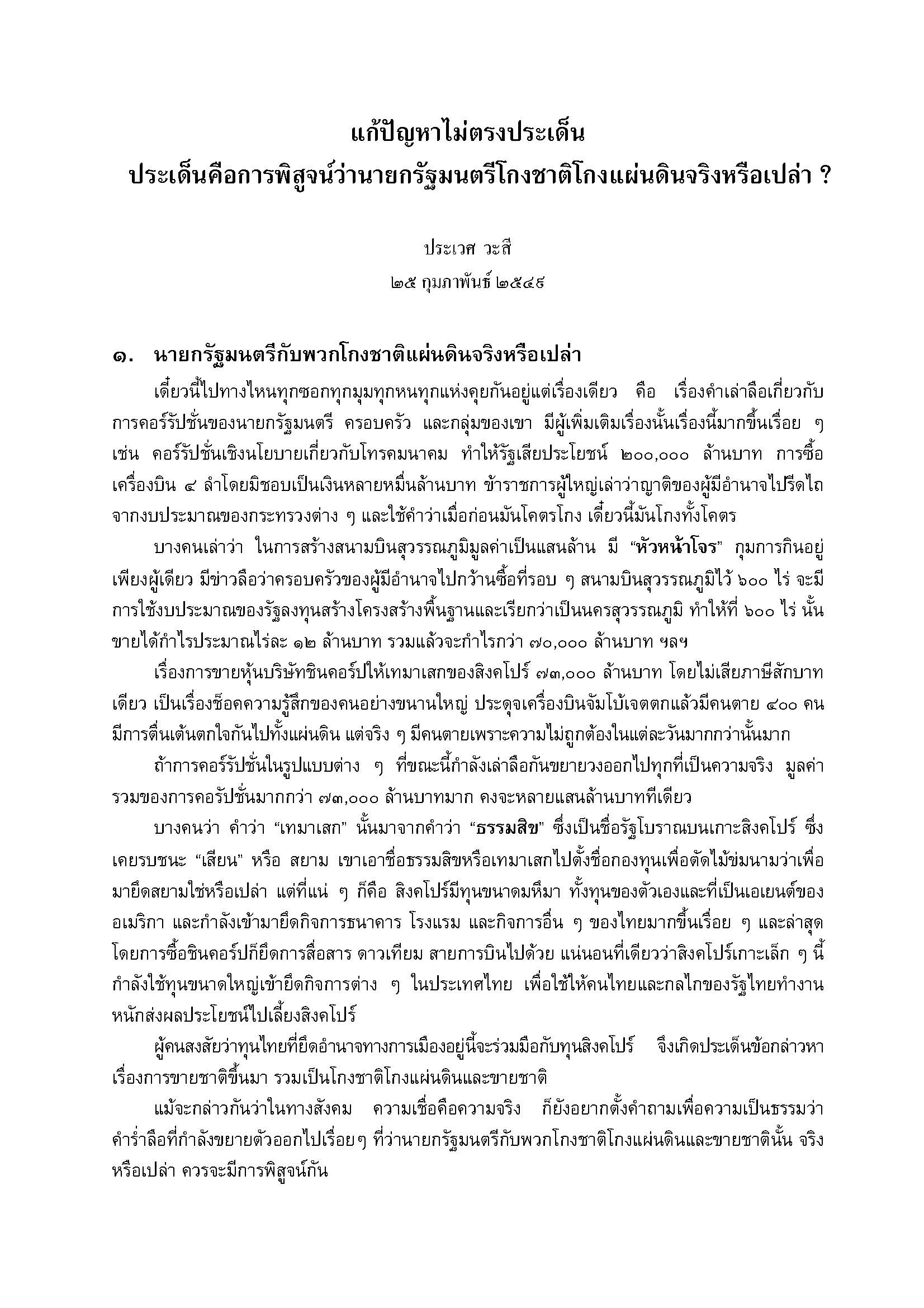 เอกสารนี้ผู้เขียนได้กล่าวถึงแก้ปัญหาไม่ตรงประเด็น ประเด็นคือการพิสูจน์ว่านายกรัฐมนตรีโกงชาติโกงแผ่นดินจริงหรือเปล่า ? โดยมีหัวข้อดังนี้ 1) นายกรัฐมนตรีกับพวกโกงชาติแผ่นดินจริงหรือเปล่า 2) ถ้าจริง โทษเพียงยุบสภาหรือลาออกแค่นั้นหรือ 3) นายกรัฐมนตรีคือผู้ที่รู้ดีที่สุดว่าจริงหรือไม่จริง 4) เป็นหน้าที่ของการเมืองภาคประชาชน 5) ศีลธรรมอยู่เหนือการเมืองอยู่เหนือกฎหมาย และ 6) ปิดยุคการเมืองธนกิจ เปิดยุคการเมืองของพลเมือง