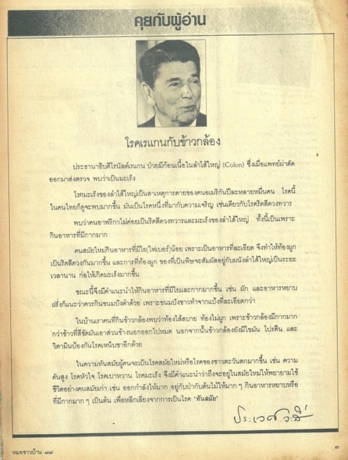 คุยกับผู้อ่าน : โรคเรแกนกับข้าวกล้อง (นิตยสารหมอชาวบ้าน ฉบับที่ 77 เดือนกันยายน พ.ศ. 2528)