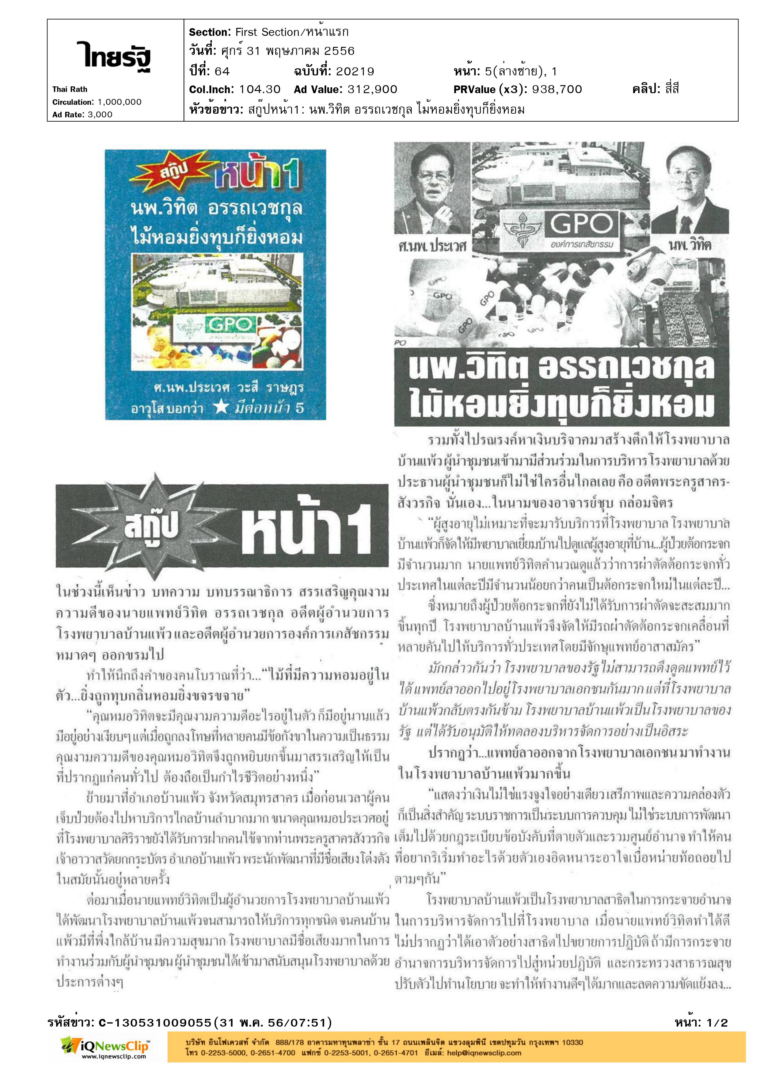 ศ.นพ. ประเวศ วะสี ได้เขียนบทความเรื่อง สกู๊ปหน้า1: นพ.วิทิต อรรถเวชกุล ไม้หอมยิ่งทุบก็ยิ่งหอมตีพิมพ์ในไทยรัฐ ปีที่ 64 ฉบับที20219 ในที่31 พฤษภาคม 2556 บอกเล่าเรื่องราวการทำงานของ นพ.วิทิต อรรถเวชกุล อดีตผู้อำนวยการโรงพยาบาลบ้านแพ้ว อำเภอบ้านแพ้ว จังหวัดสมุทรสาคร ในช่วงมารับตำแหน่งผู้อำนวยการโรงพยาบาล มีการพัฒนาการจัดให้บริการต่างๆที่ครอบคลุมมากยิ่งขึ้น ทำให้ประชาชนในอำเภอบ้านแพ้วไม่ต้องเดินทางไกลไปรักษาที่ สถานพยาบาลอื่นๆ