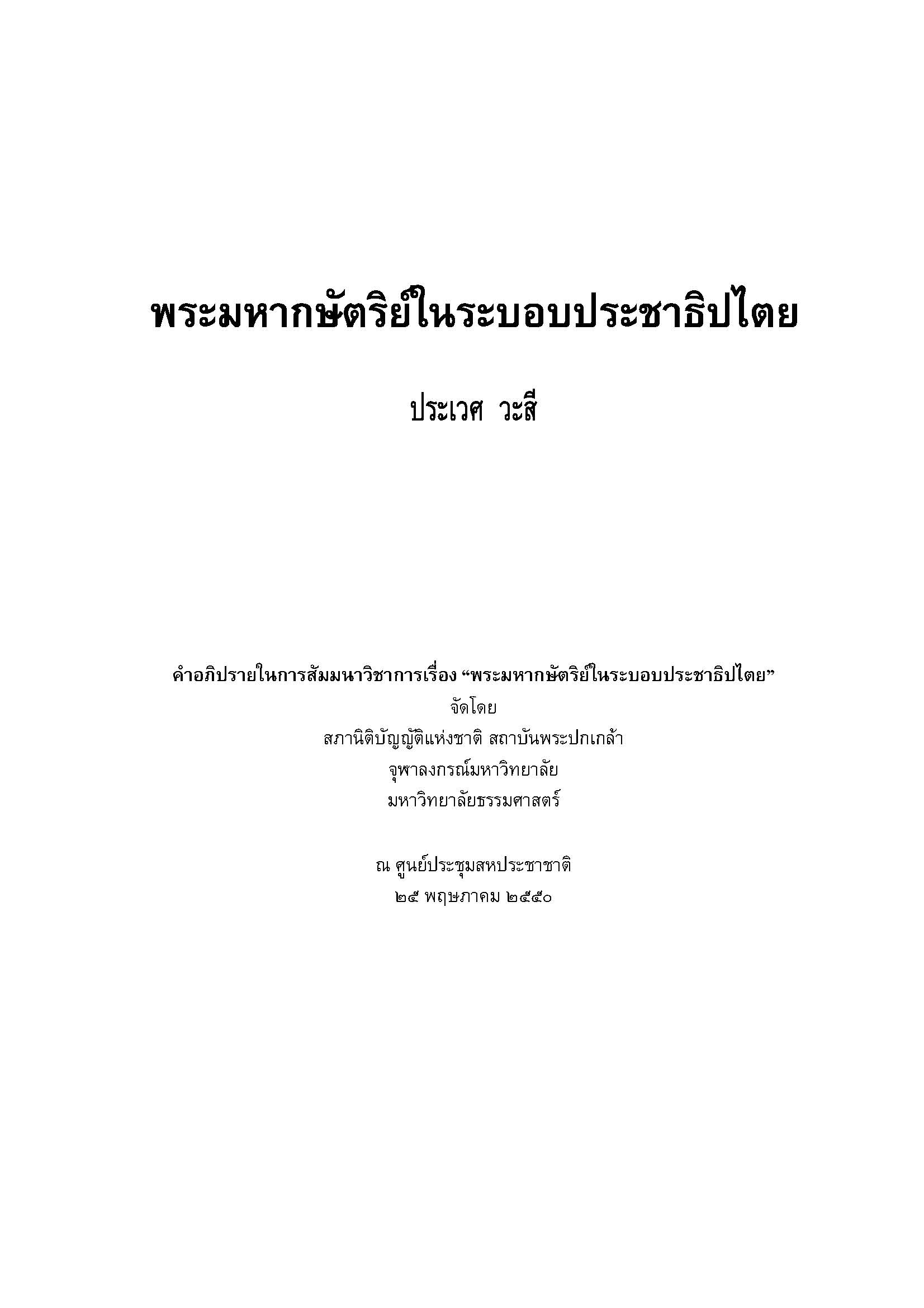 เนื้อหานี้เป็นคำอภิปรายในการสัมมนาวิชาการเรื่อง "พระมหากษัตริย์ในระบอบประชาธิปไตย" จัดโดย สภานิติบัญญัติแห่งชาติ สถาบันพระปกเกล้า จุฬาลงกรณ์มหาวิทยาลัย มหาวิทยาลัยธรรมศาสตร์ ณ ศูนย์ประชุมสหประชาชาติ เมื่อวันที่ 25 พฤษภาคม 2550 มีหัวข้อดังนี้ 1) แนวคิดและบทเรียน 2) แนวทางการพัฒนาระบอบประชาธิปไตยให้ลงตัว 3) รัฐและพระมหากษัตริย์ในระบอบประชาธิปไตย และ 4) กระบวนการทางสังคม เพื่อพัฒนารากฐานของระบอบประชาธิปไตย