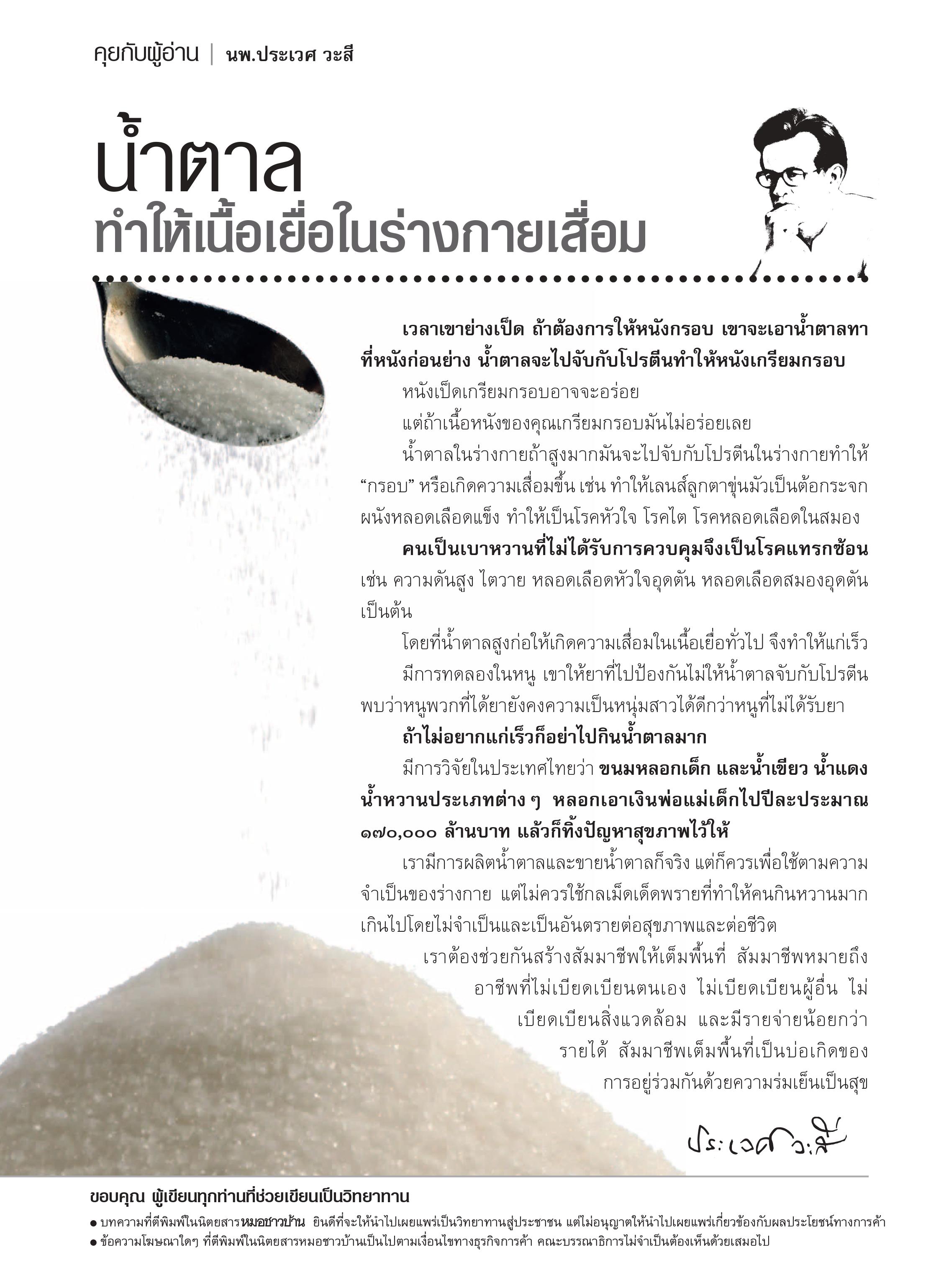 คุยกับผู้อ่าน : น้ำตาล ทำให้เนื้อเยื่อในร่างกายเสื่อม (นิตยสารหมอชาวบ้าน พ.ศ.2556)