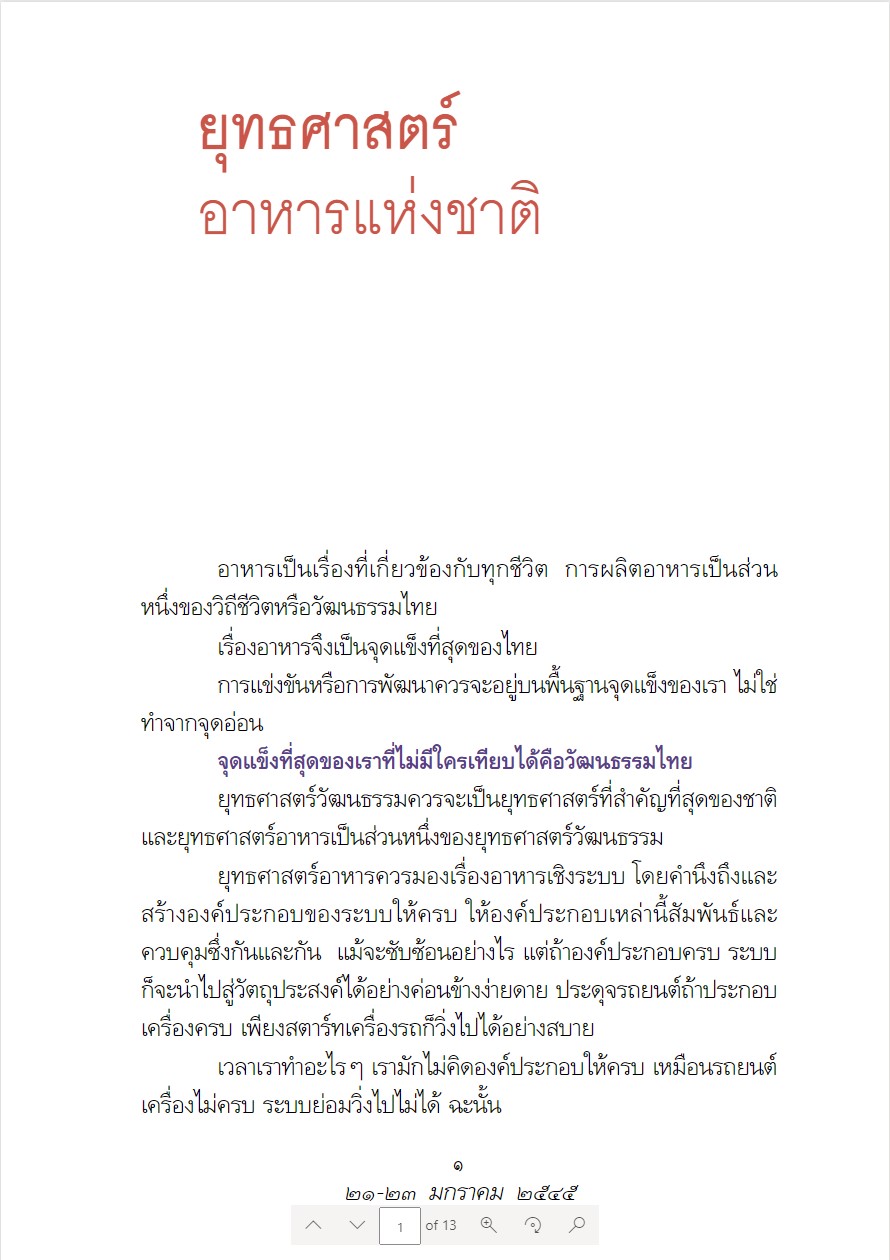 เอกสารนี้กล่าวถึงยุทธศาสตร์อาหารแห่งชาติที่เป็นจุดแข็งของวัฒนธรรมไทย โดยเสนอองค์ประกอบของระบบอาหารให้ครบ ซึ่งมี 17 องค์ประกอบ คือ 1.อาหารกับจิตสำนึกความเป็นมนุษย์และจิตวิญญาณ 2.อาหารกับการศึกษา การเรียนรู้ และการสื่อสาร 3.อาหารกับวัฒนธรรม 4.อาหารกับสุขภาพ 5.อาหารกับเศรษฐกิต 6.อาหารกับศีลธรรม-คนไทยทุกคนต้องมีกินอิ่ม 7.อาหารกับการใช้ทรัพยากรอย่างเป็นธรรม 8.อาหารกับการอนุรักษ์สิ่งแวดล้อม 9.อาหารกับสัมมาอาชีวะ 10.มาตรฐานคุณภาพอาหาร 11.อาหารกับการสร้างสังคมเข้มแข็ง 12.อาหารกับการท่องเที่ยว 13.นวัตกรรมทางอาหารและระบบข้อมูลข่าวสาร 14.อาหารกับหัตถกรรม อุตสาหกรรม และพาณิชยกรรม 15.อาหารกับความสัมพันธ์ระหว่างประเทศ 16.ระบบนโยบายอาหาร 17.ระบบวิจัยเรื่องอาหาร-กองทุนวิจัยอาหาร