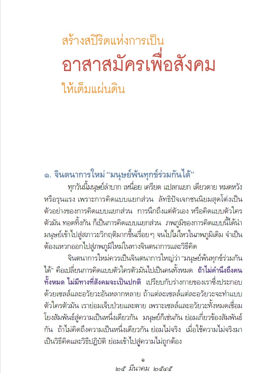 เอกสารนี้กล่าวถึงการเป็นอาสาสมัครเพื่อสังคมในเรื่องต่าง ๆ เช่น การดูแลคนแก่ คนพิการ คนป่วย เด็กกำพร้า ช่วยคนจนเลี้ยงลูก ช่วยเป็นเพื่อนหญิงและเด็กที่ต้องเดินทางในที่เปลี่ยว ต่าง ๆ เหล่านี้จะข่วยเปิดพื้นที่ทางสังคม ที่ทำให้เกิดพลังแผ่นดินหรือภูมิพละ เป็นการหว่านเมล็ดพันธุ์แห่งความดีให้งอกงามเต็มแผ่นดิน