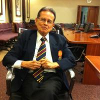 อาจารย์ประเวศ วะสี ใส่เสื้อเชิ้ตสีขาว สูทสีดำ ผูกเนคไทลายทแยง