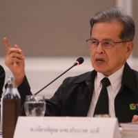 อาจารย์ประเวศ วะสี ใส่เสื้อเชิ้ตสีขาว ใส่เสื้อแขนยาวสีดำ ผูกเนคไทสีดำ