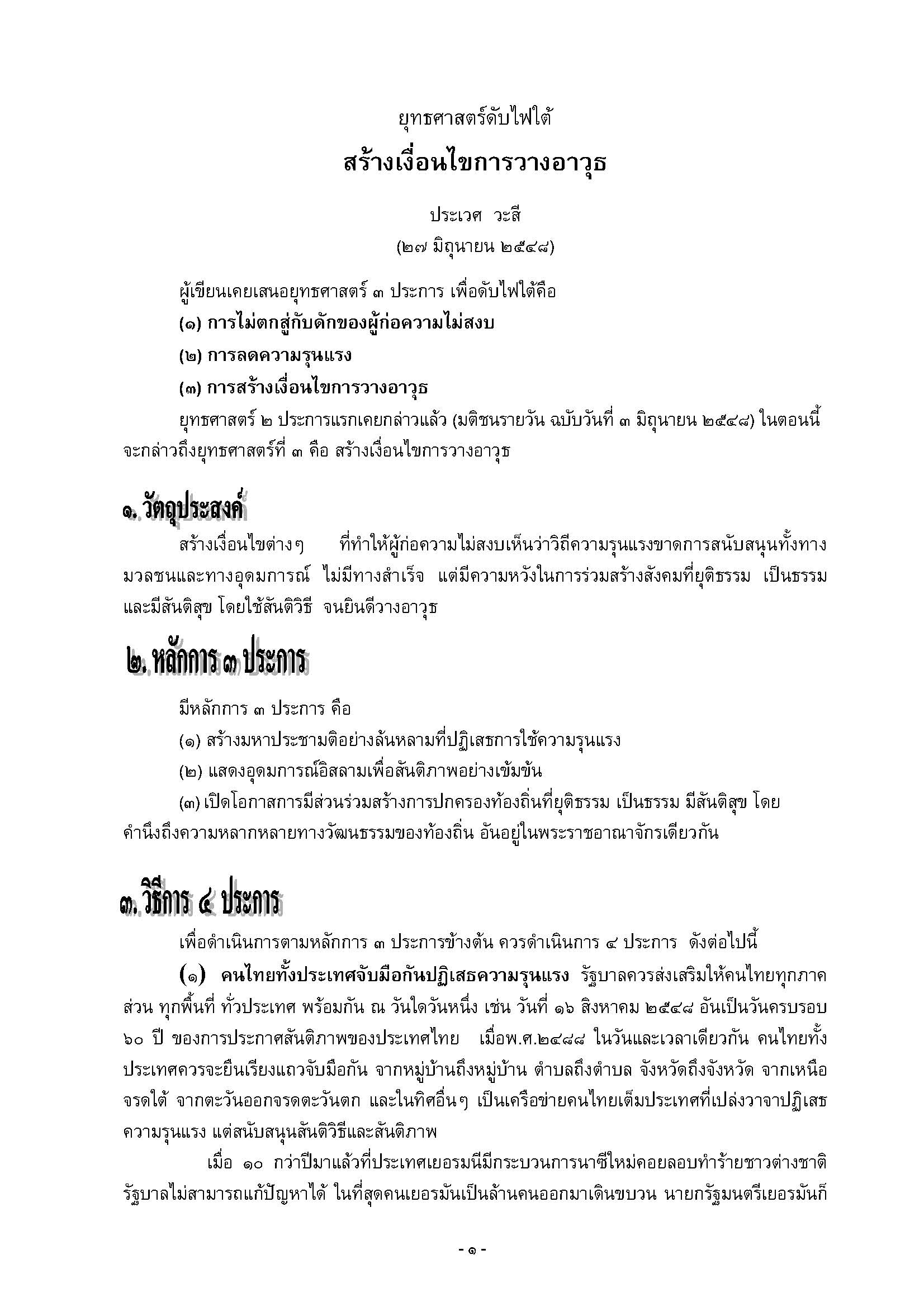 ซึ่งยุทธศาสตร์ 2 ประการแรก เคยกล่าวไว้ใน หนังสือพิมพ์มติชนรายวัน ฉบับวันที่ 3 มิถุนายน 2548) และในเอกสารนี้ได้กล่าวถึงยุทธศาสตร์ที่ 3 คือ สร้างเงื่อนไขการวางอาวุธ