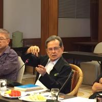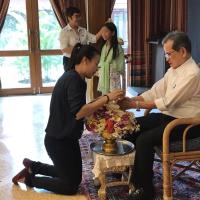 อาจารย์ประเวศ วะสี สวมเสื้อ สวมเสื้อเชิ้ตสีขาว และสวมเสื้อแขนยาวสีดำ โดยภายในงานมีกิจกรรมรดน้ำดำหัวอาจารย์ประเวศ เพื่อขอพรด้วย