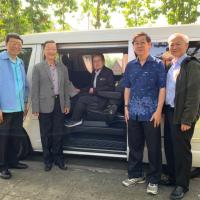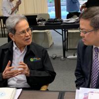 อาจารย์ประเวศ วะสี สวมเสื้อเชิ้ตสีฟ้าลายขาว และสวมเสื้อแขนยาวสีดำ