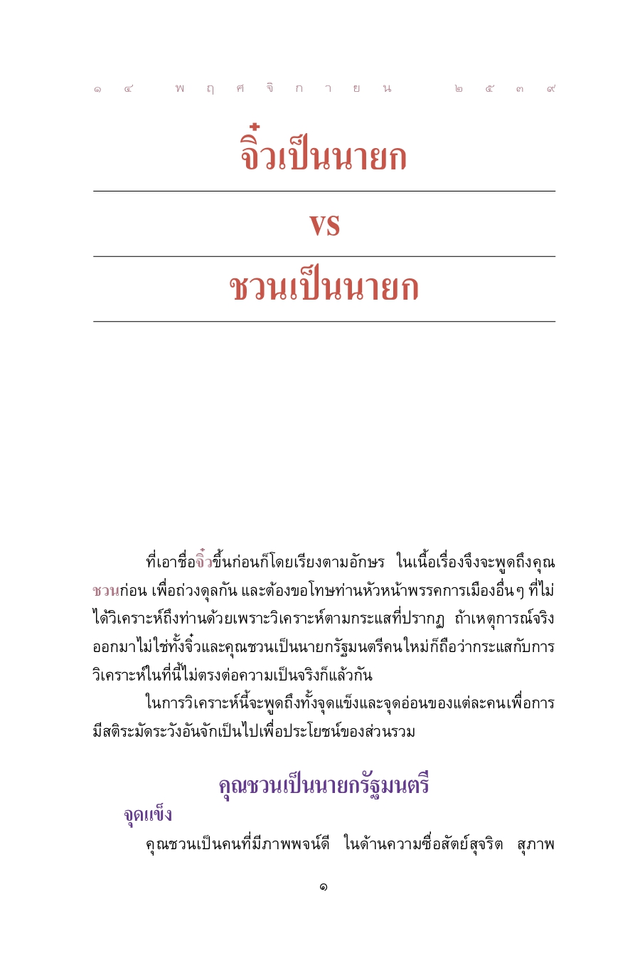เนื้อหาในเอกสารกล่าวถึงการวิเคราะห์จุดแข็งและจุดอ่อนของคุณจิ๋วและคุณชวน หากท่านใดได้เป็นนายกรัฐมนตรีคนใหม่ นอกจากนี้ศาสตราจารย์นายแพทย์ประเวศ วะสี มีข้อแนะนำเพิ่มเติม ดังนี้ 1. ไม่ว่าคุณชวนหรือคุณจิ๋วจะเป็นนายกรัฐมนตรี ประชาชนควรรักษาอารมณ์ไว้ให้มาก 2. การเมืองต้องเป็นเรื่องของประชาชนทุกคน 3. ส่งเสริมให้ประชาชนรวมตัวในรูปแบบต่างๆ 4. การเข้าถึงข้อมูลข่าวสารการบริหารราชการแผ่นดิน 5. การสร้างและการใช้ความรู้จริง