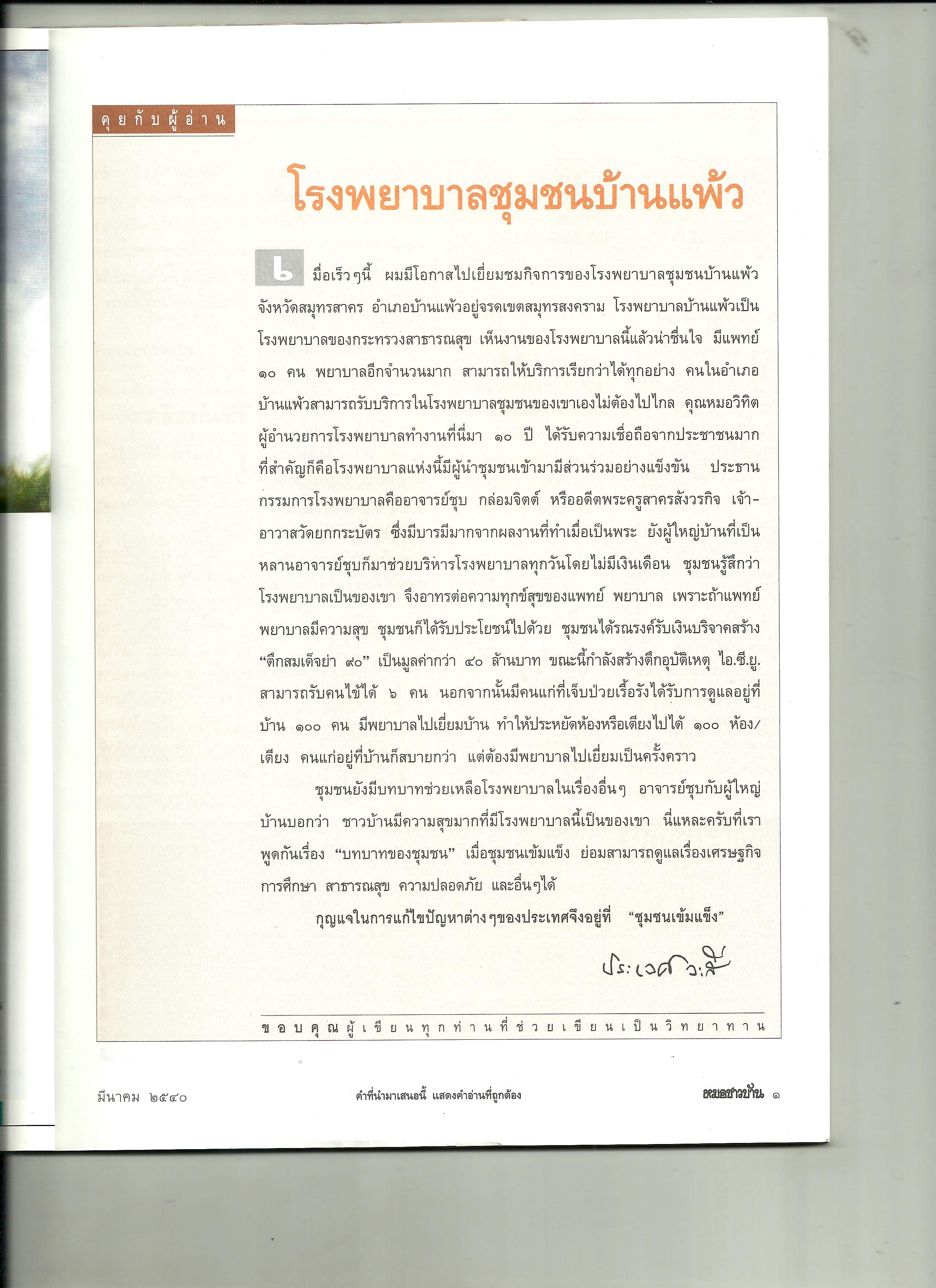 คุยกับผู้อ่าน : โรงพยาบาลชุมชนบ้านแพ้ว (นิตยสารหมอชาวบ้าน ฉบับที่ 215 เดือนมีนาคม พ.ศ. 2540)