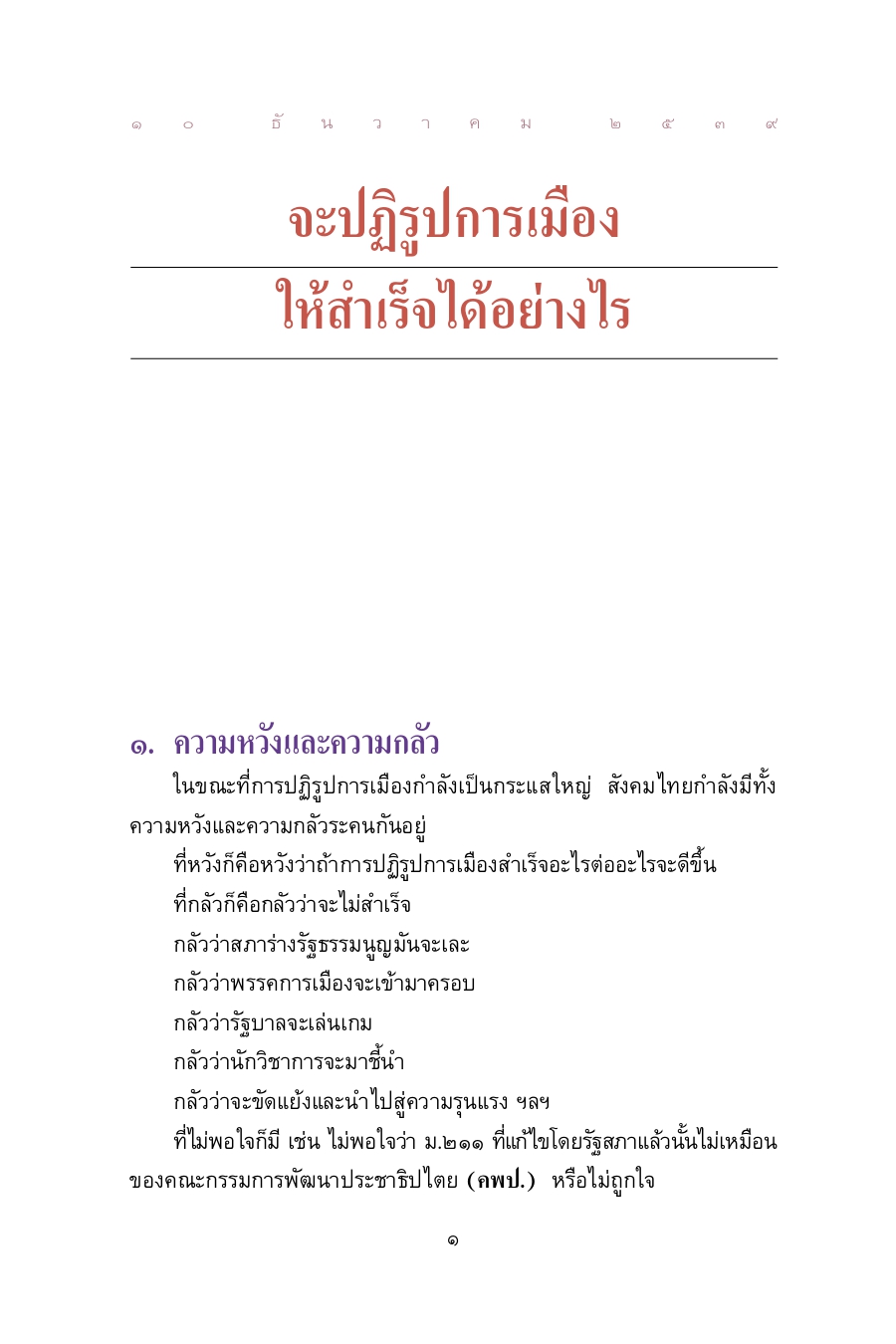 เนื้อหาในเอกสารกล่าวถึงการปฏิรูปการเมืองของไทยให้สำเร็จ ควรเริ่มต้นด้วยการไม่พูดทางลบให้เสียกำลังใจ คนไทยควรมีจินตนาการที่ยิ่งใหญ่ร่วมกันว่า คนไทยปฏิรูปการเมืองได้ จากนั้นเริ่มจากสภาพความเป็นจริงที่ดำรงอยู่ เช่น ม. 211 ที่รัฐสภาแก้ไขออกมาไม่ตรงกับที่ คปพ. เสนอ ถ้าเราจะให้ไปทำแบบ คปพ. หรือกลับไปแก้ ม. 211 ใหม่ อย่างนี้ก็กลับไปไกลเกิน ก่อความยุ่งยากสับสนและคงจะไม่สำเร็จ ดังนั้นในระยะนี้ยังไม่ควรกลับไปแก้กฎกติกาที่จะทำงานในเรื่องนี้ ให้ยอมรับกฎกติกาที่เกิดขึ้นแล้วพยายามทำในเงื่อนไขที่มีเสียก่อน นอกจากลองแล้วทำไม่ได้จริงๆ ค่อยเสนอการแก้ไขกฎกติกา และสิ่งสำคัญของการปฏิรูปการเมืองก็คือการมีส่วนร่วมของทุกฝ่ายทั้งประชาชน สื่อมวลชน สภาร่างรัฐธรรมนูญ นักวิชาการ รัฐบาล และรัฐสภา