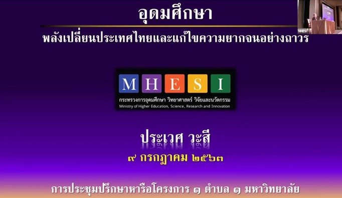 คลิปวิดีโอจากปาฐกถาพิเศษเรื่อง "อุดมศึกษาพลังเปลี่ยนประเทศไทยและแก้ไขความยากจนอย่างยั่งยืนถาวร" ภายในการประชุมปรึกษาหารือ "กรอบและแนวทางขับเคลื่อนโครงการ 1 ตำบล 1 มหาวิทยาลัย" พร้อมทั้งมอบกรอบนโยบายการขับเคลื่อนโครงการ 1 ตำบล 1 มหาวิทยาลัย งานดังกล่าวจัดขึ้นที่ โรงแรมมิราเคิลแกรนด์ คอนเวนชั่น ถนนวิภาวดีรังสิต กรุงเทพฯ วันที่ 9 กรกฎาคม 2563