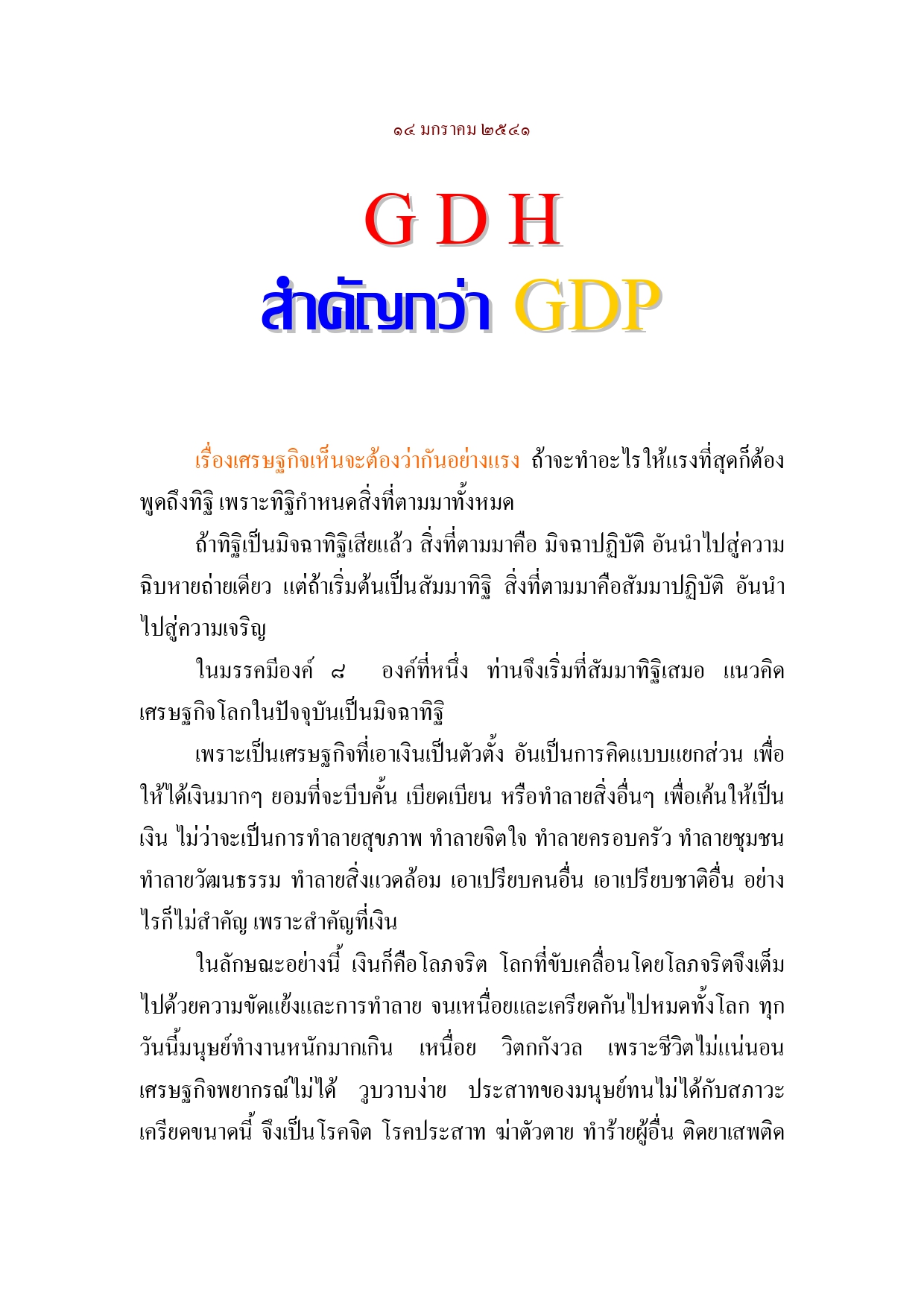 เนื้อหาในเอกสารกล่าวถึง GDP (Gross Domestic Product) หรือรายได้ประชาชาติ คือเครื่องชี้วัดความเจริญทางเศรษฐกิจ แต่เราควรเปลี่ยนเครื่องชี้วัดกันใหม่เป็น GDH ซึ่ง H หมายถึง Happiness หรือความสุข โดยสามารถตีความคำว่า ความสุข ได้เชื่อมโยงครอบคลุมมากกว่า P หรือการผลิตเท่านั้น เช่น หมายถึงการมีความเอื้ออาทรต่อกัน มีครอบครัวอบอุ่น มีชุมชนเข้มแข็ง มีวัฒนธรรม มีสิ่งแวดล้อมที่ดี และมีเศรษฐกิจพอเพียง สิ่งเหล่านี้สามารถนำมาสร้างเครื่องชี้วัดได้ อาจเรียกว่า ดัชนีวัดความสุขแบบไทย
