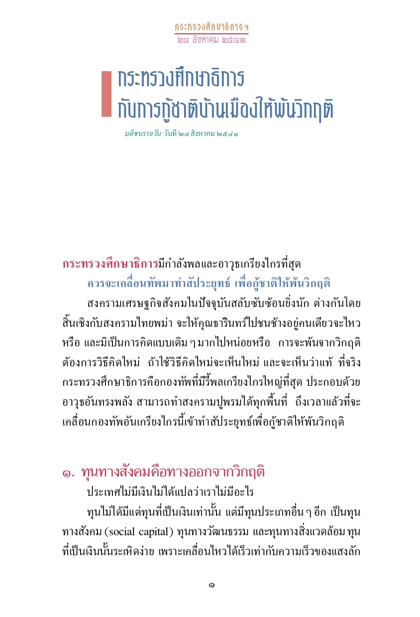 เนื้อหาในเอกสารกล่าวถึงกระทรวงศึกษาธิการมีบทบาทสำคัญในการแก้วิกฤตเศรษฐกิจและสังคมของประเทศ เนื่องจากในกระทรวงศึกษาธิการมีวัด โรงเรียน และหน่วยงานทางวัฒนธรรม หากนำการศึกษา ศาสนา และวัฒนธรรมมาเชื่อมโยงกับวิถีชีวิตจริง สิ่งเหล่านี้จะเป็นพลังมหาศาลช่วยให้สังคมไทยพ้นวิกฤตและนำไปสู่การพัฒนาที่ยั่งยืน