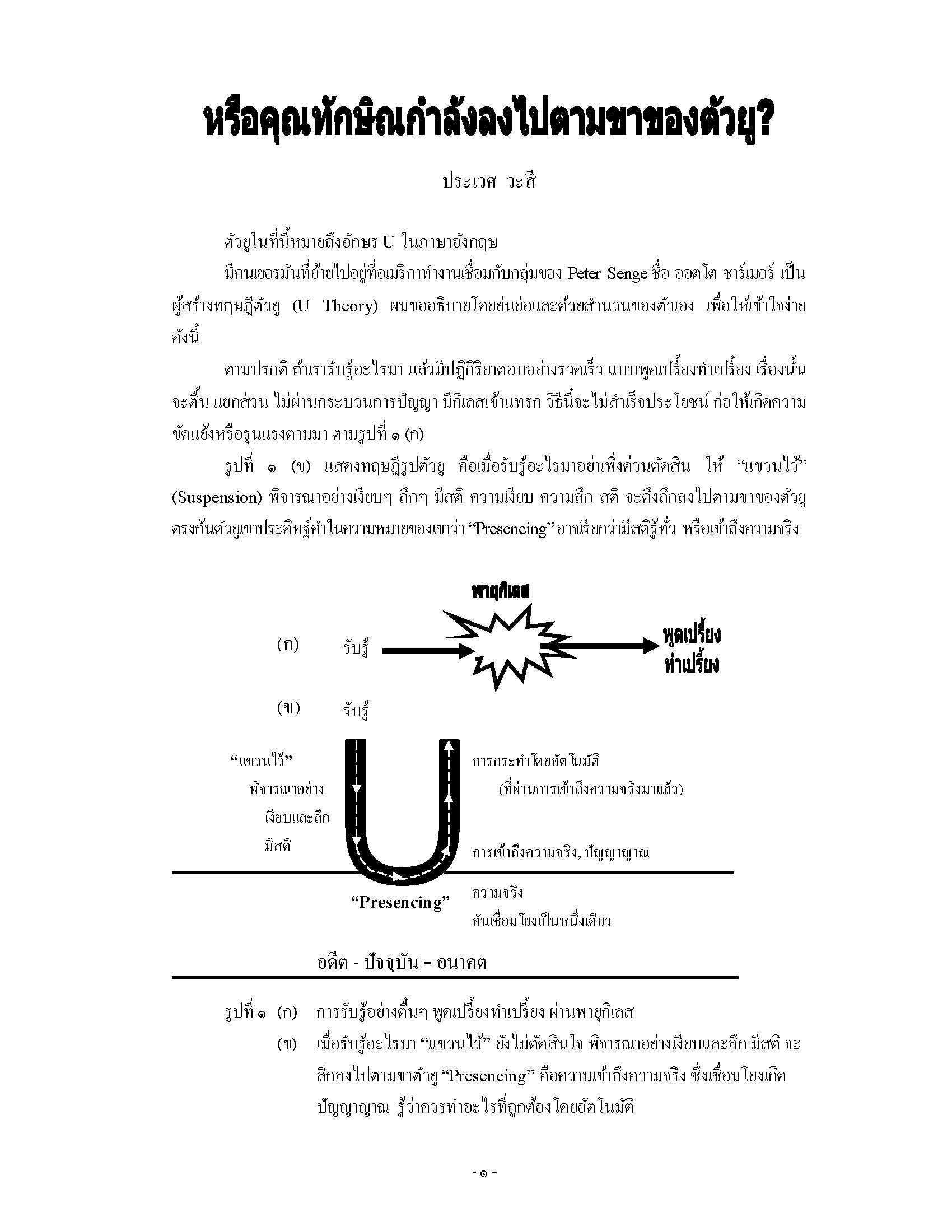 ผู้เขียนได้อธิบายเกี่ยวกับทฤษฎีตัวยู (U Theory) และเชื่อมโยงกับท่านนายกฯ ทักษิณ หลังกลับมาจากประเทศญี่ปุ่นว่ากำลังลงไปตามขาตัวยูหรือไม่ พร้อมกับเปรียบเปรยว่า ถ้าประเทศมีผู้นำที่เดินตามวิถีตัวยูหรือวิถีแห่งสติ จะเป็นเหตุปัจจัยให้คนทั้งประเทศหันมาสนใจวิถีแห่งสติวิถีทางปัญญา ประเทศจะพ้นภัยพิบัติทั้งปวง มีศานติสุขหรืออยู่เย็นเป็นสุข