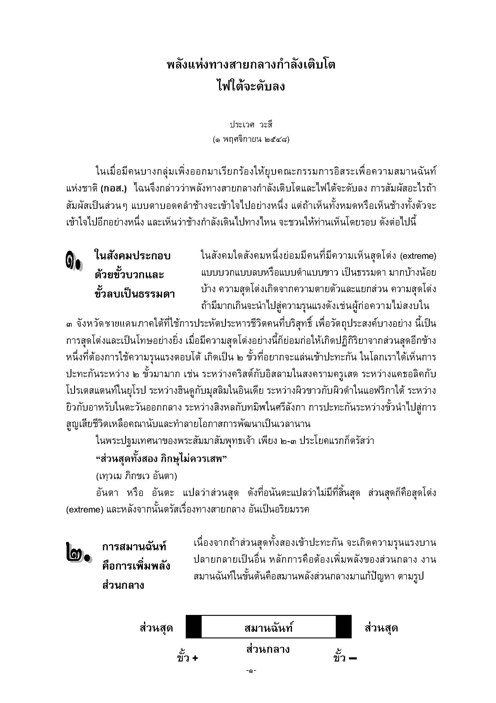 เอกสารนี้กล่าวถึงเรื่องพลังแห่งทางสายกลางกำลังเติบโต ไฟใต้จะดับลง ประกอบด้วยเนื้อหาดังนี้ 1) ในสังคมประกอบด้วยขั้วบวกและขั้วลบเป็นธรรมดา 2) การสมานฉันท์คือการเพิ่มพลังส่วนกลาง 3) พื้นฐานแห่งทางสายกลางของคนไทย 4) การเติบโตของพลังแห่งทางสายกลาง 5) สมานฉันทร์ไม่ได้แปลว่าไม่จับผู้ร้าย 6) สร้างเงื่อนไขการวางอาวุธ 7) ใช้วิกฤตไฟใต้สร้างสมรรถนะของไทยในการเผชิญวิกฤตใหญ่ร่วมกันในอนาคต