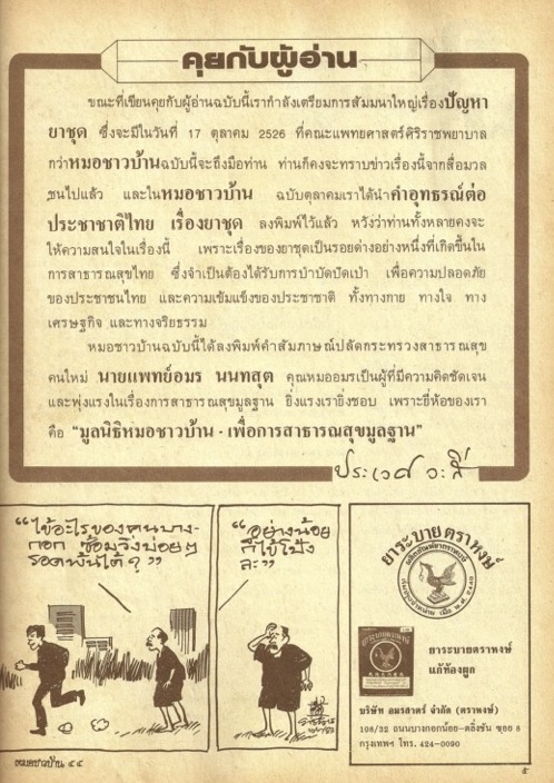 เนื้อหาในเอกสารกล่าวถึงการจัดสัมมนาเรื่องปัญหายาชุด ในวันที่ 17 ตุลาคม 2526 ที่คณะแพทยศาสตรศิริราชพยาบาล และกล่าวถึงบทความเรื่อง คำอุทธรณ์ต่อประชาชาติไทย เรื่องยาชุด ที่ตีพิมพ์ในฉบับตุลาคม 2526 นอกจากนี้ยังกล่าวถึงการสนับสนุนสาธารณสุขมูลฐานของนายแพทย์อมร นนทสุต ปลัดกระทรวงสาธารณสุข ช่วงท้าย ปรากฏการ์ตูนเรื่อง การเสียดสีปัญหาสังคมเรื่องไข้โป้ง ที่เขียนโดย ชัย ราชวัตร และข้อมูลโฆษณายาระบายตราหงษ์
