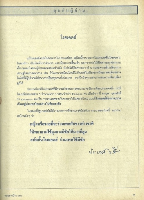 คุยกับผู้อ่าน : เอดส์ - มหันตภัยของสังคมไทย (นิตยสารหมอชาวบ้าน ฉบับที่ 124 เดือนสิงหาคม พ.ศ. 2532)