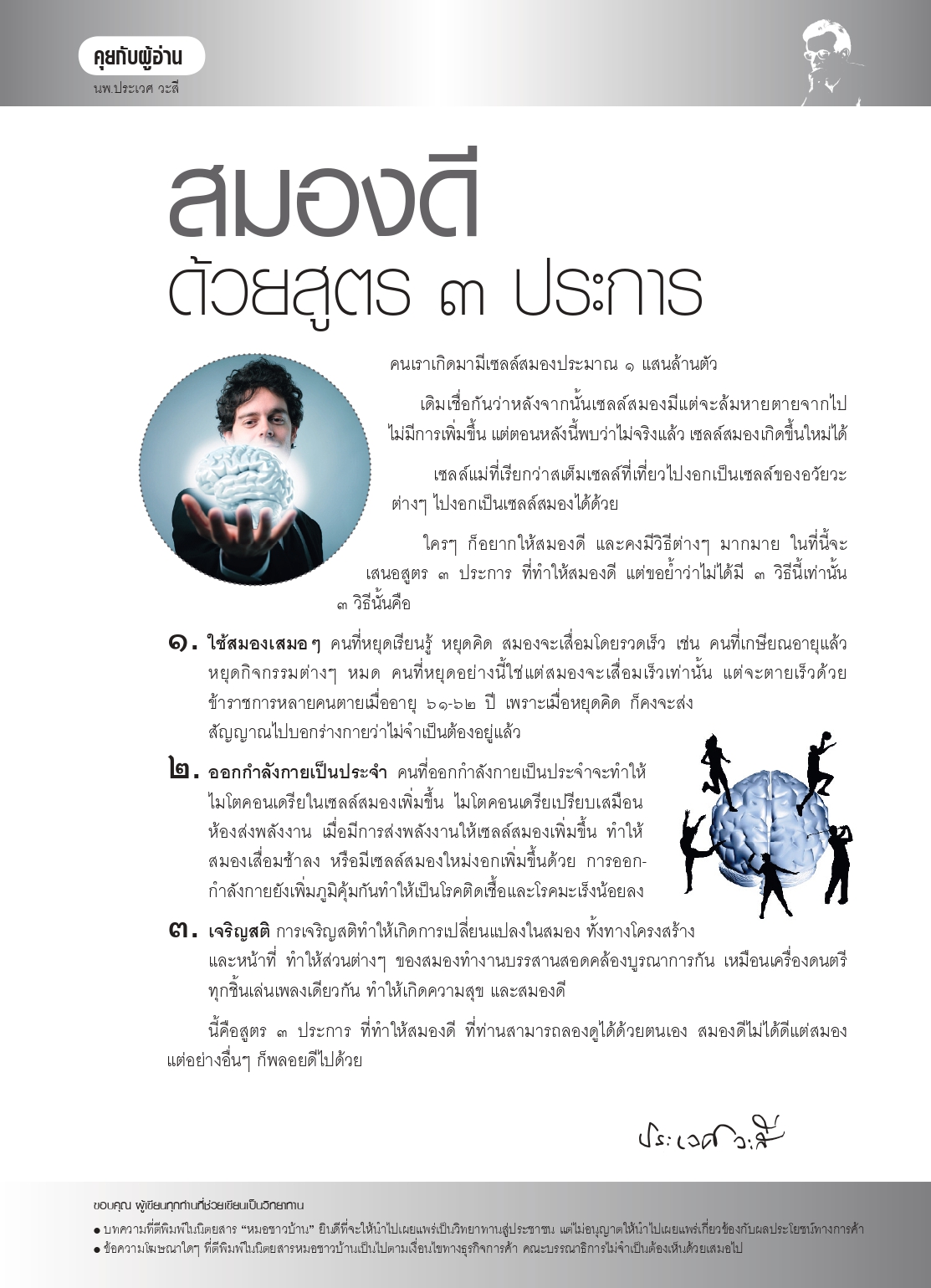 คุยกับผู้อ่าน : สมองดี ด้วยสูตร 3 ประการ (นิตยสารหมอชาวบ้าน พ.ศ. 2555)