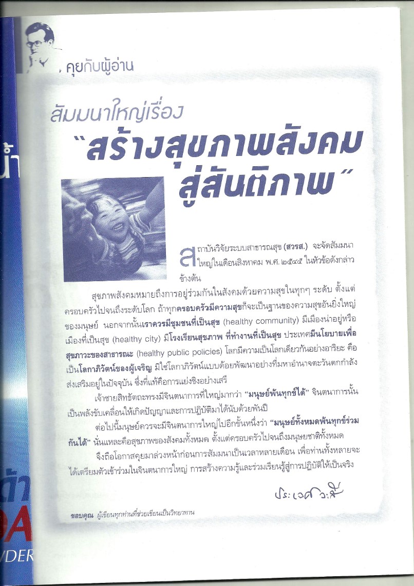 คุยกับผู้อ่าน : สัมมนาใหญ่เรื่อง สร้างสุขภาพสังคมสู่สันติภาพ (นิตยสารหมอชาวบ้าน ฉบับที่ 276 เดือนเมษายน พ.ศ. 2545)