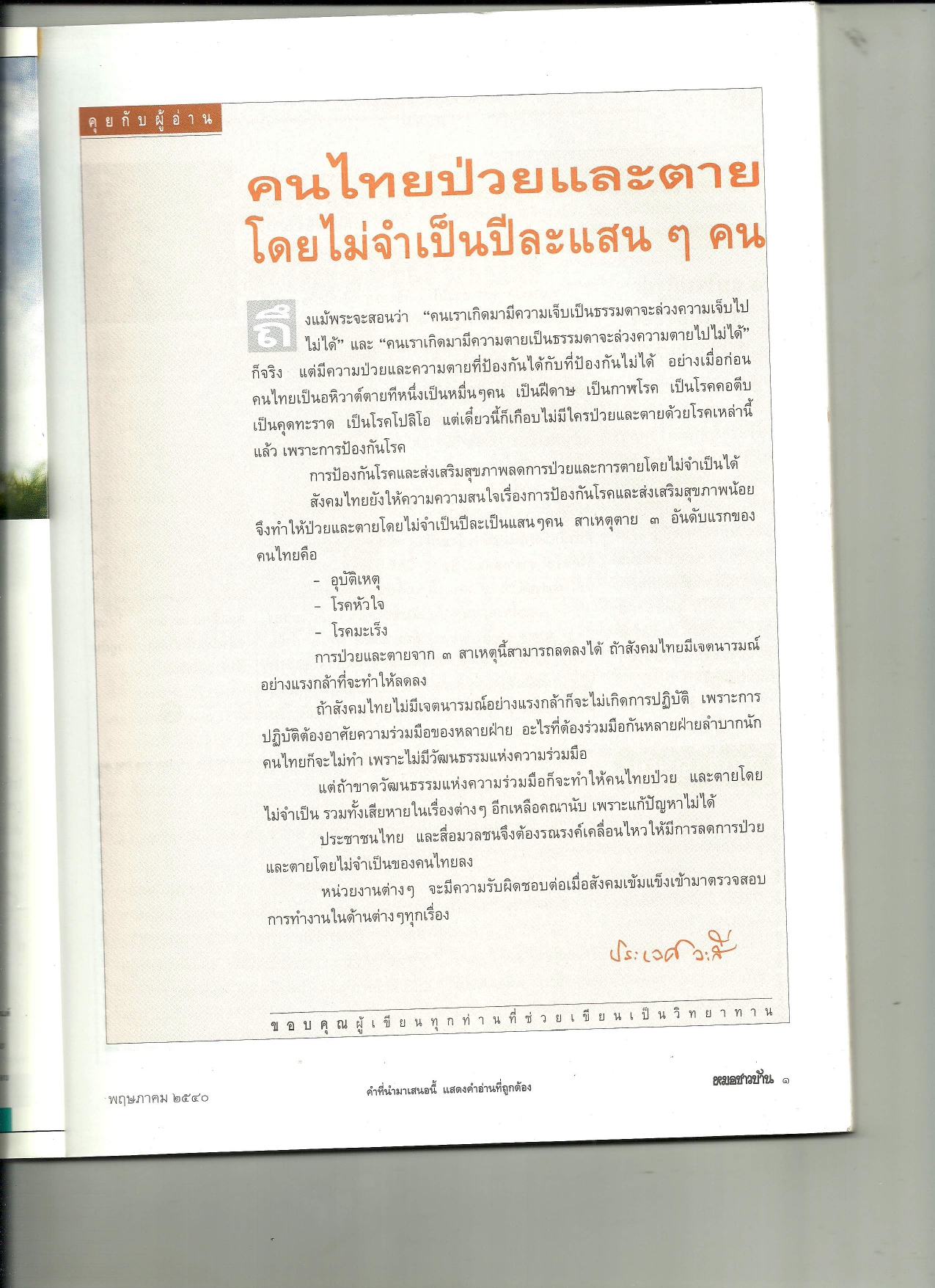 คุยกับผู้อ่าน : คนไทยป่วยและตายโดยไม่จำเป็นปีละแสน ๆ คน (นิตยสารหมอชาวบ้าน ฉบับที่ 217 เดือนพฤษภาคม พ.ศ. 2540)