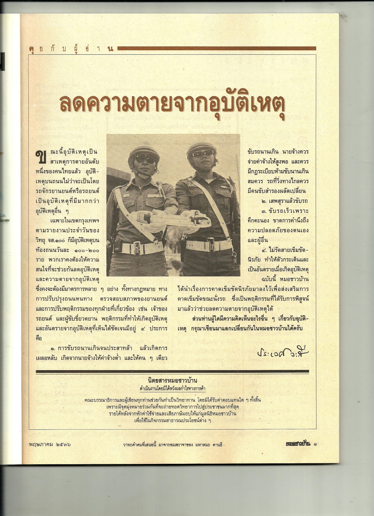 คุยกับผู้อ่าน : ลดความตายจากอุบัติเหตุ (นิตยสารหมอชาวบ้าน ฉบับที่ 169 เดือนพฤษภาคม พ.ศ. 2536)