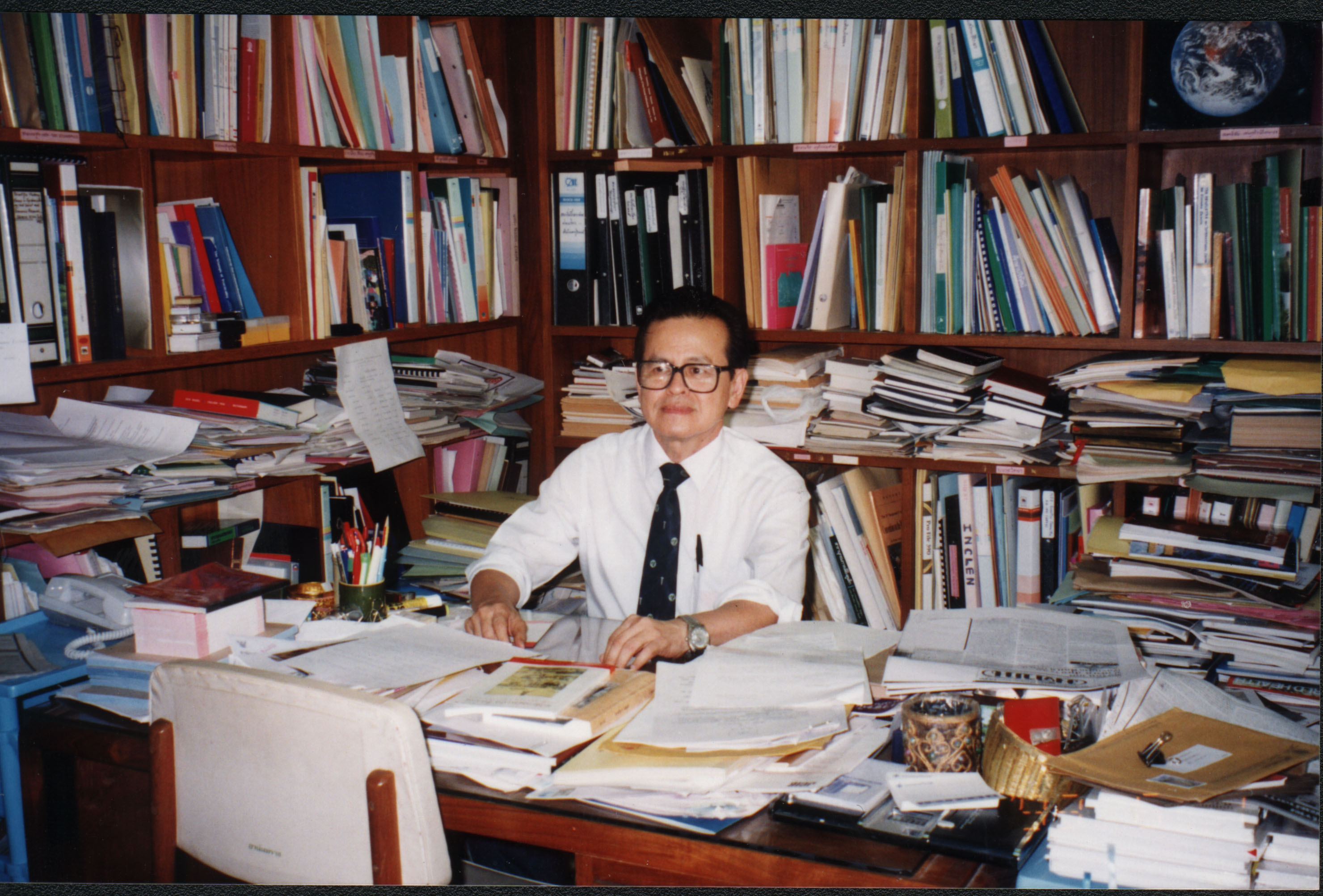 อาจารย์ประเวศ วะสี สวมเสื้อเชิ้ตสีขาว และผูกเนคไทสีดำ นั่งอยู่บนโต๊ะทำงาน.jpg