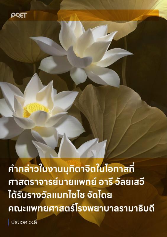 Part of คำกล่าวในงานมุทิตาจิตในโอกาสที่ ศาสตราจารย์นายแพทย์ อารี วัลยเสวี ได้รับรางวัลแมกไซไซ จัดโดย คณะแพทยศาสตร์โรงพยาบาลรามาธิบดี ณ วันที่ 11 กันยายน 2530