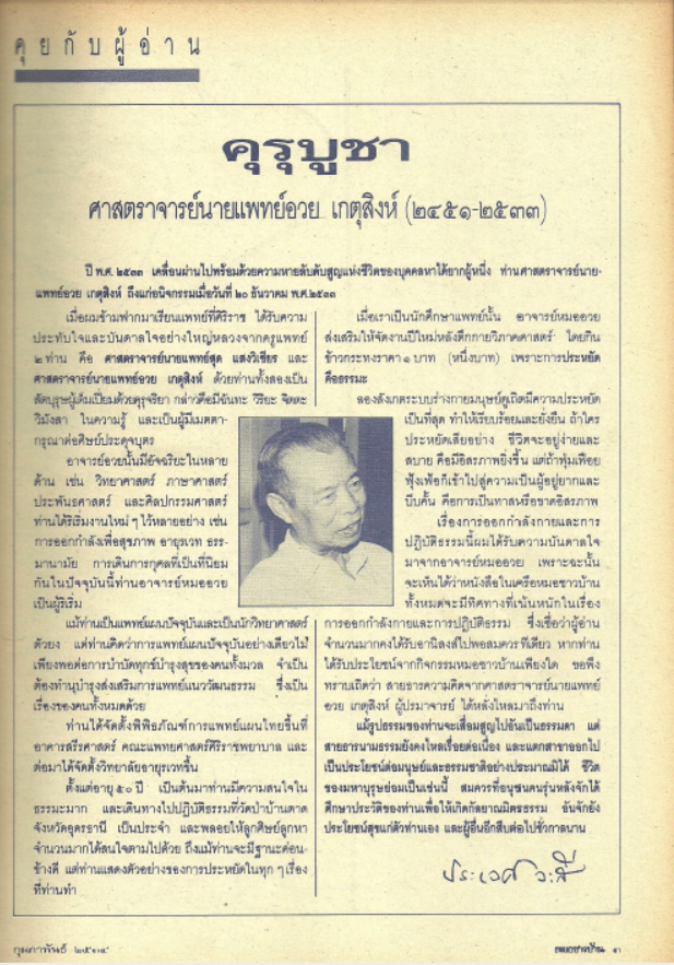 คุยกับผู้อ่าน : คุรุบูชา ศาสตราจารย์นายแพทย์อวย เกตุสิงห์ (นิตยสารหมอชาวบ้าน ฉบับที่ 142 เดือนกุมภาพันธ์ พ.ศ. 2534)