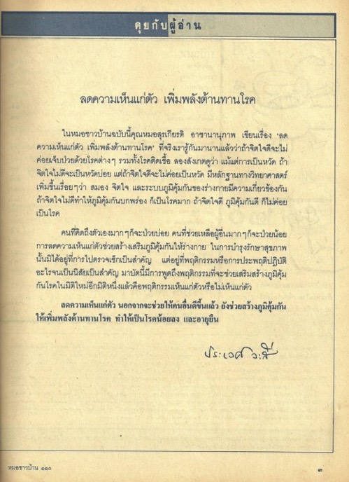 คุยกับผู้อ่าน : ลดความเห็นแก่ตัว เพิ่มพลังต้านทานโรค (นิตยสารหมอชาวบ้าน ฉบับที่ 110 เดือนมิถุนายน พ.ศ. 2531)