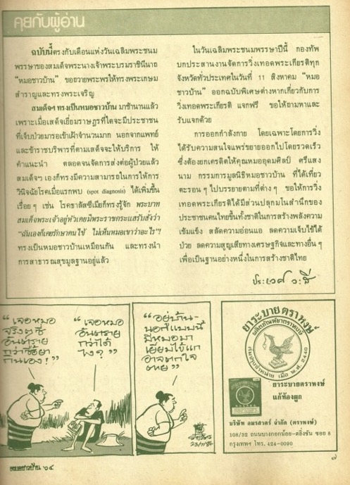 เนื้อหาในเอกสารกล่าวถวายพระพรสมเด็จพระนางเจ้าฯ พระบรมราชินีนาถ เนื่องในวันเฉลิมพระชนมพรรษาของสมเด็จพระนางเจ้าฯ พระบรมราชินีนาถ นอกจากนี้ ผู้เขียนยังกล่าวถึงบทบาทการสนับสนุนสาธารณสุขพื้นฐานของพระองค์ ผู้เขียนบรรยายถึงการจัดกิจกรรมการวิ่งเทิดพระเกียรติที่จัดโดยกองทัพบกในวันที่ 11 สิงหาคม โดยนิตยสารหมอชาวบ้านได้ตีพิมพ์ฉบับพิเศษเกี่ยวกับการวิ่งเทิดพระเกียรติ ผู้เขียนยังกล่าวถึงความสำคัญของการออกกำลังกาย และกล่าวถึงนายแพทย์อุดมศิลป์ ศรีแสงนาม ในฐานะที่ส่งเสริมและเผยแพร่ความรู้ด้านการออกกำลังกายด้วยการวิ่ง ช่วงท้าย ปรากฏการ์ตูนเรื่อง การเยี่ยมไข้ของหมอในชนบท ที่เขียนโดย ชัย ราชวัตร และข้อมูลโฆษณายาระบายตราหงษ์ -