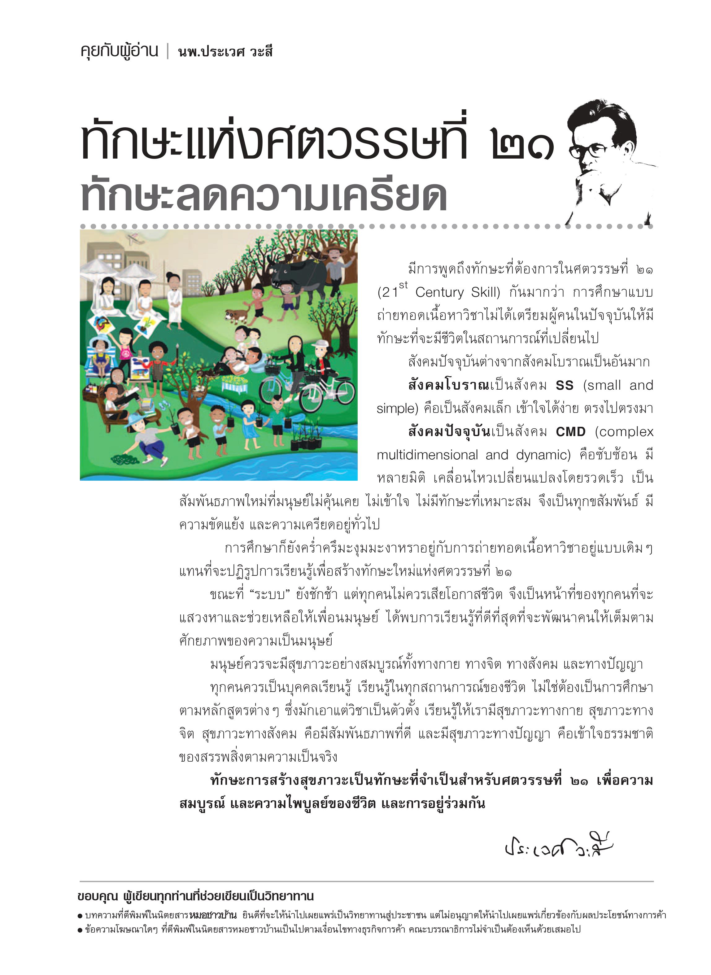 คุยกับผู้อ่าน : ทักษะแห่งศตวรรษที่21 ทักษะลดความเครียด (นิตยสารหมอชาวบ้าน พ.ศ.2556 )