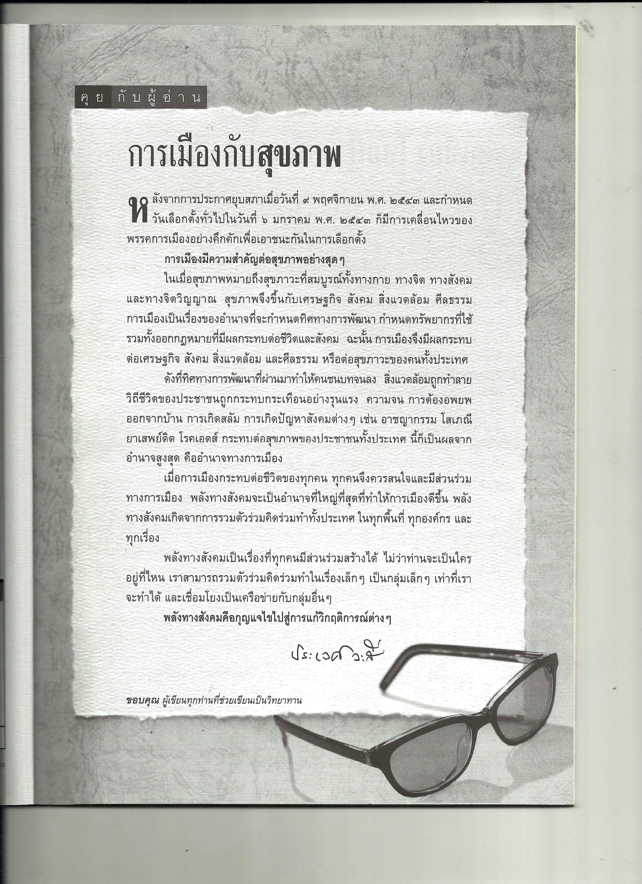 คุยกับผู้อ่าน : การเมืองกับสุขภาพ (นิตยสารหมอชาวบ้าน ฉบับที่ 260 เดือนธันวาคม พ.ศ. 2543)