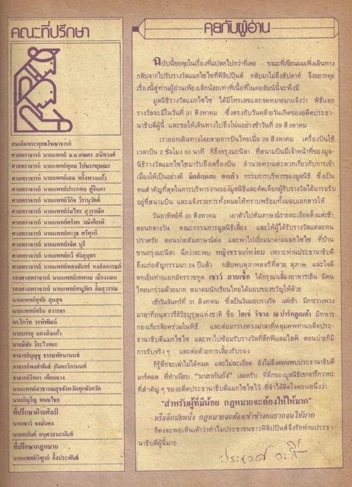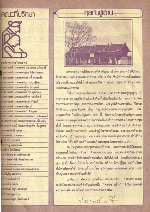 เนื้อหาในเอกสารปรากฏรายชื่อของคณะที่ปรึกษาของนิตยสาร ผู้เขียนกล่าวถึงบทบาทของสงฆ์ที่มีต่อการพัฒนาชุมชนผ่านความร่วมมือของมหาเถรสมาคม กระทรวงสาธารณสุข กระทรวงมหาดไทยและมูลนิธิหมอชาวบ้าน ในการจัดการประชุมระดับชาติ เรื่อง พระสงฆ์กับการสาธารณสุขมูลฐาน ในเดือนมิถุนายน 2524 โดยพระบาทสมเด็จพระเจ้าอยู่หัวเสด็จพระราชดำเนินเป็นองค์ประธานทรงเปิดการประชุม นอกจากนี้ ผู้เขียนยังกล่าวถึงบทบาทของวัดในฐานะที่เป็นศูนย์กลางของชุมชนที่มีบทบาทต่อการพัฒนาสังคมไทย -