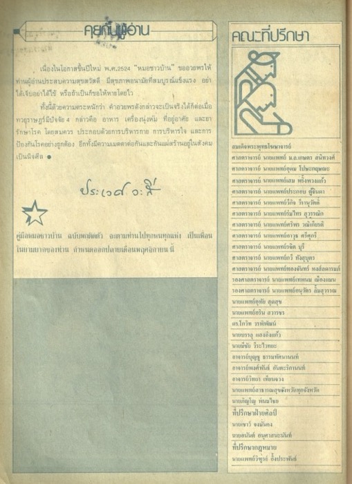 เนื้อหาในเอกสารปรากฏรายชื่อของคณะที่ปรึกษาของนิตยสาร ผู้เขียนกล่าวอวยพรผู้อ่านในโอกาสขึ้นปีใหม่ พ.ศ. 2525 ผู้เขียนในนามของบรรณาธิการกล่าวขอบคุณผู้มีส่วนสนับสนุนนิตยสารทั้งหมด และอธิบายถึงเจตนารมณ์ของการจัดทำนิตยสารว่าเป็นไปเพื่อสื่อสารความรู้และเทคนิคในการป้องกันและรักษาโรคเพื่อประโยชน์แก่ประชาชนและสังคมทุกภาคส่วน -