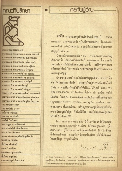 เนื้อหาในเอกสารปรากฏรายชื่อของคณะที่ปรึกษาของนิตยสารและจุดมุ่งหมายในการดำเนินงานของนิตยสาร ผู้เขียนกล่าวถึงการจัดงานฉลองกรุงรัตนโกสินทร์ 200 ปี โดยแสดงทัศนะว่าควรมุ่งระลึกถึงสติและปัญญาทดแทนการมุ่งให้ความสำคัญเฉพาะวัตถุเพื่อเฉลิมฉลอง นอกจากนี้ ยังกล่าวถึงการประยุกต์ใช้หลักอริยสัจ 4 ในการเข้าใจสภาพปัญหาสังคมไทย -