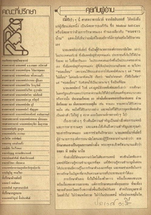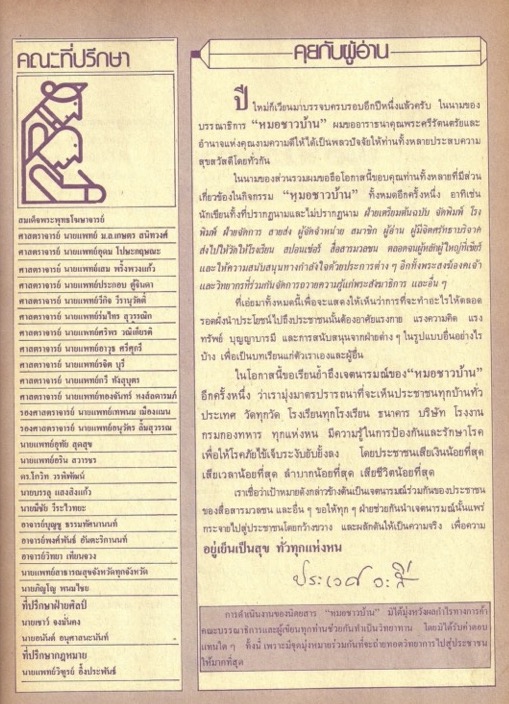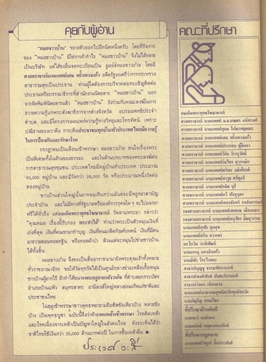 เนื้อหาในเอกสารปรากฏรายชื่อของคณะที่ปรึกษาของนิตยสาร และกล่าวถึงการก่อตั้งมูลนิธิหมอชาวบ้านที่มีศาสตราจารย์นายแพทย์เสม พริ้งพวงแก้ว เป็นประธาน นอกจากนี้ ผู้เขียนยังกล่าวถึงบทบาทของพระสงฆ์ต่อการสาธารณสุขชุมชน ผู้เขียนอ้างถึงสมเด็จพระพุทธโฆษาจารย์ วัดสามพระยา และพระครูสาครสังวรกิจ ที่ตำบลยกกระบัตร อำเภอบ้านแพ้ว สมุทรสาคร ช่วงท้าย ผู้เขียนรณรงค์ให้อดเหล้าเข้าพรรษาเพื่อป้องกันโรคติดเหล้าและโรคเนื่องจากเหล้า -